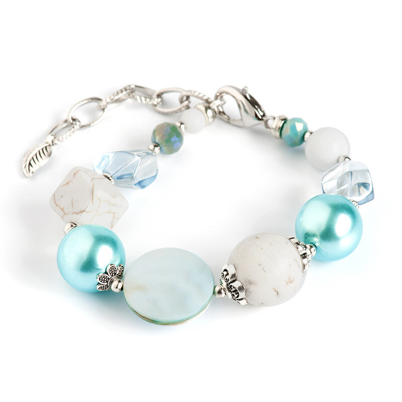 Кахолонг, яшма, перламутр, жемчуг Majorca, хрусталь, латунь. Гальваническое покрытие: родий.