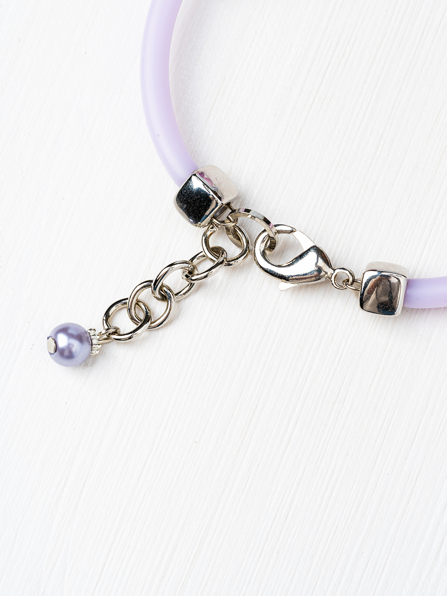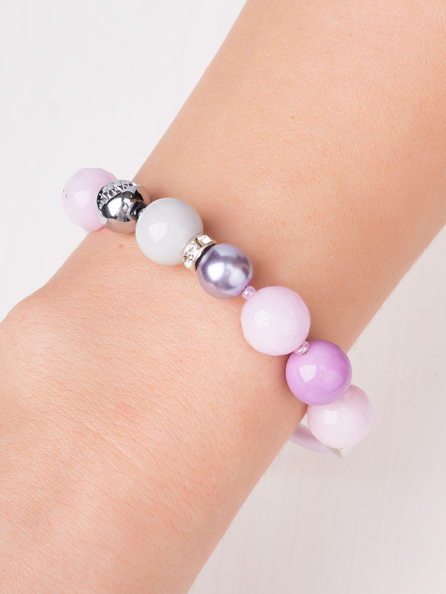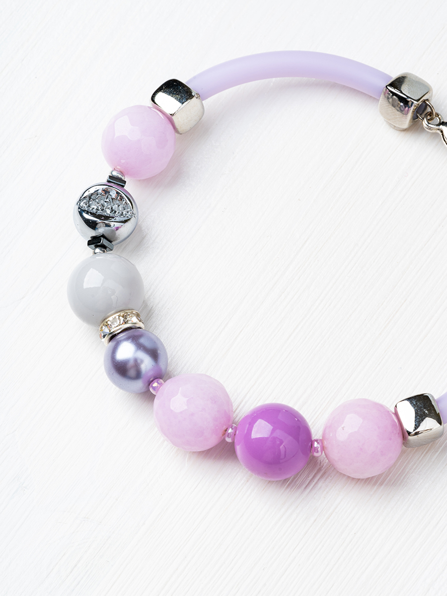 Кварцит, жемчуг Majorca, гематит, кристаллы Preciosa, каучуковый шнурок, латунь. Гальваническое покрытие: родий.