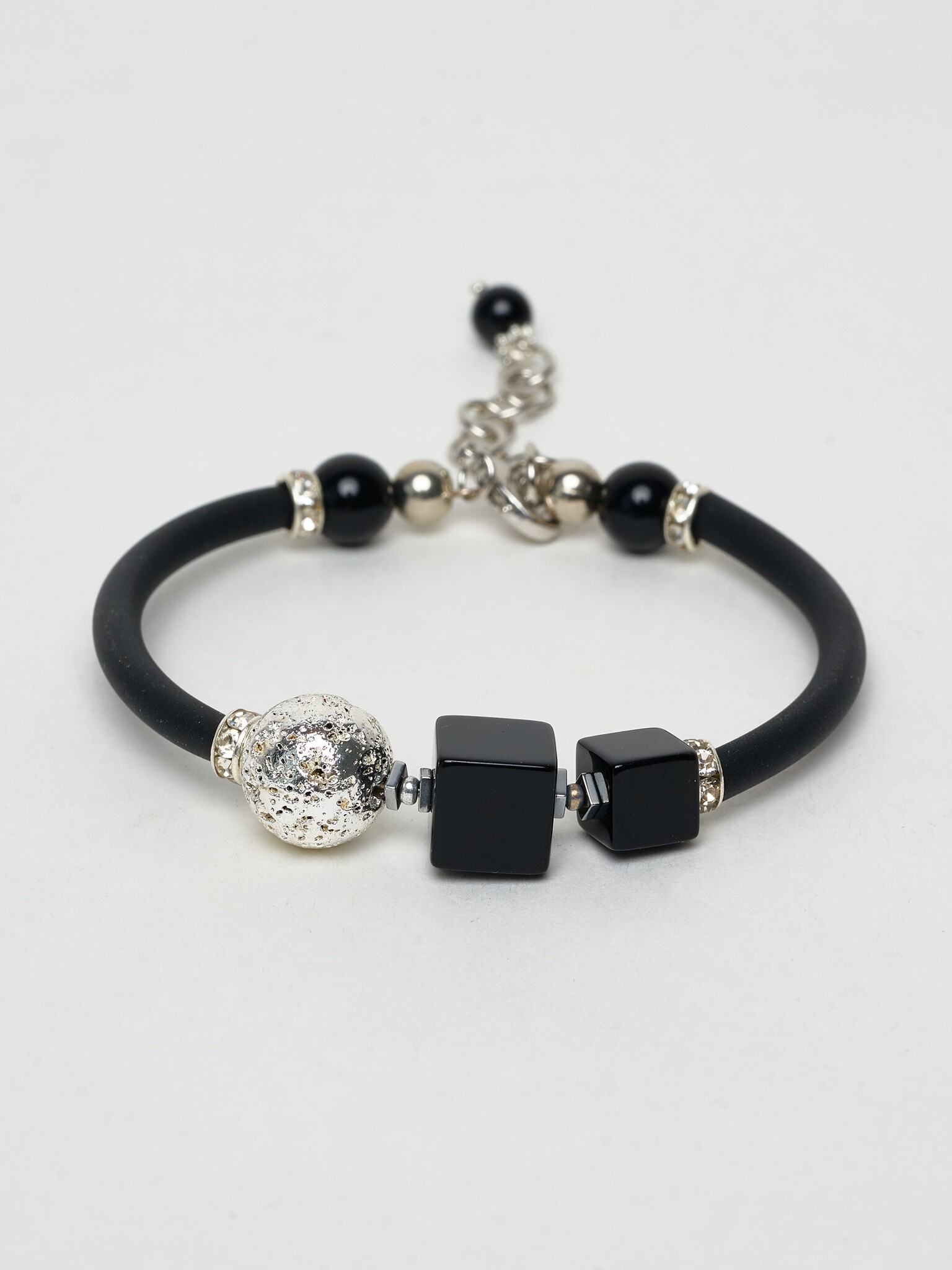 Агат, вулканическая лава, каучуковый шнурок, кристаллы Preciosa. Гальваническое покрытие: родий.