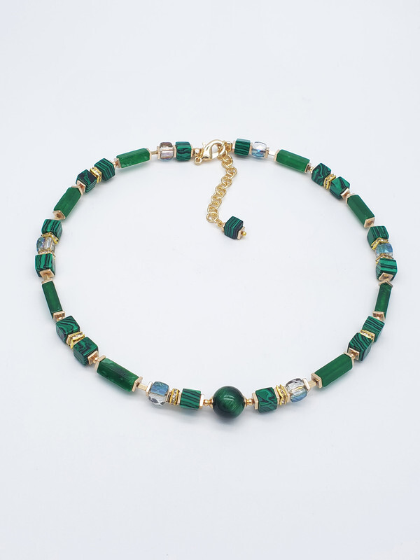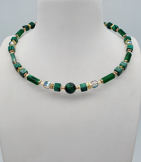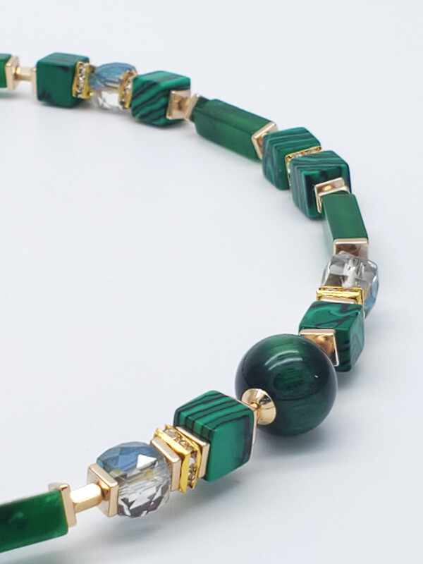 Малахит искусственный, кварц зеленый, тигровый глаз, хрустальное стекло, стразы, ювелирный сплав. Гальваническое покрытие : золото.