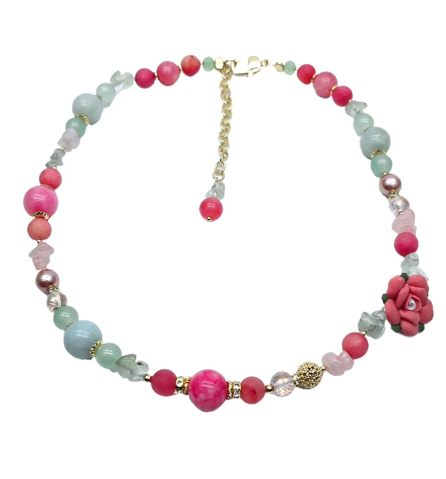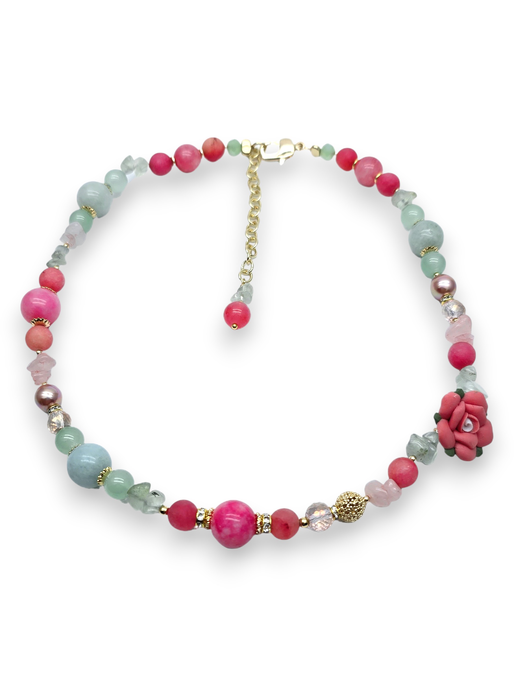 Кварц, хризопраз, розовый кварц, жемчуг Майорка, хрустальное стекло, керамика, ювелирный сплав. Гальваническое покрытие: золото.