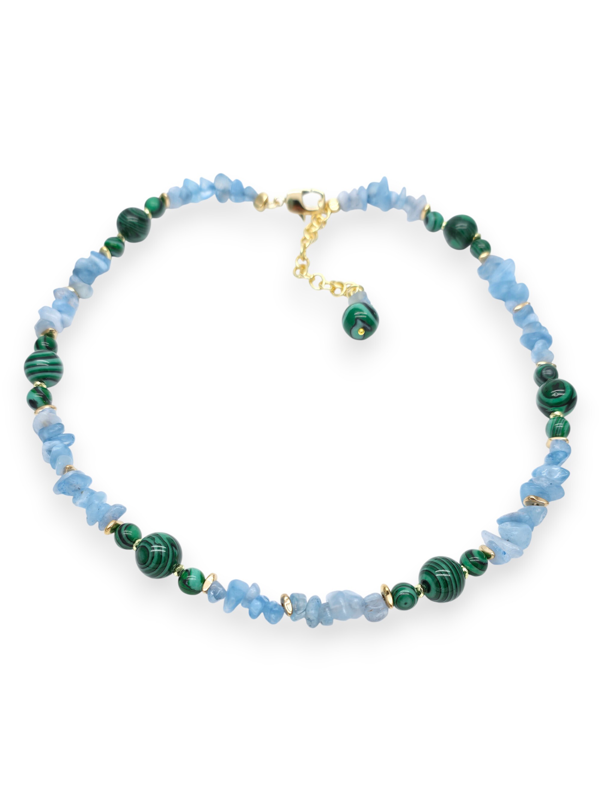 Аквамарин, малахит искусственный, гематит, ювелирный сплав. Гальваническое покрытие: золото.