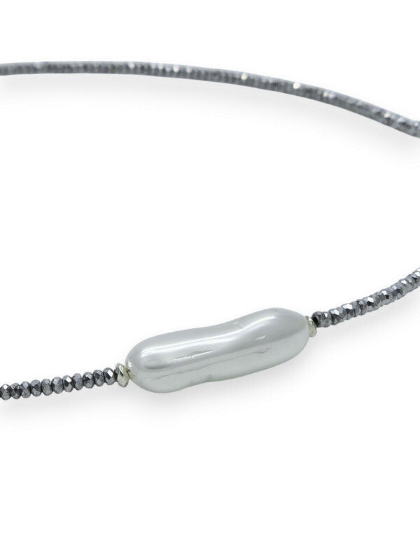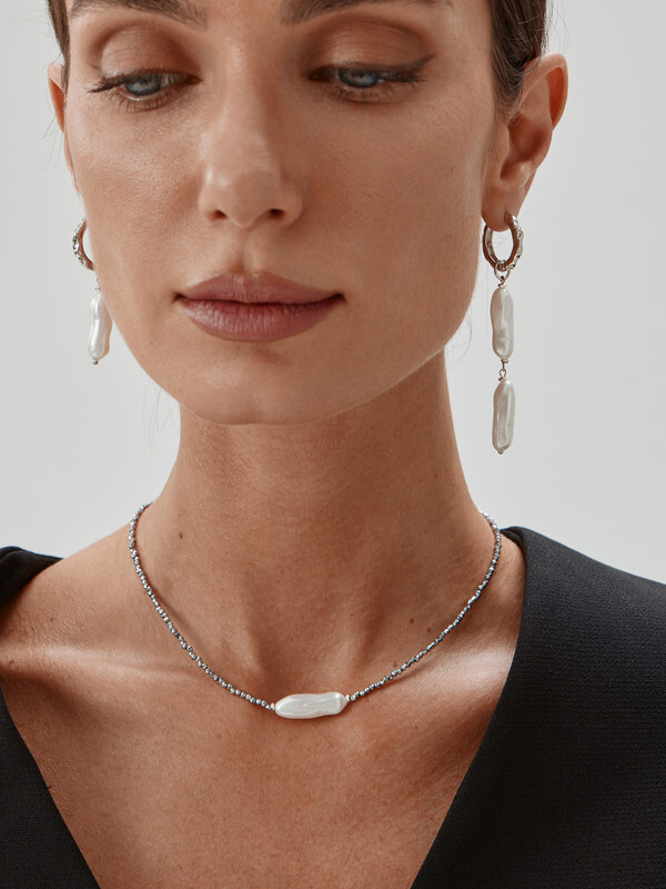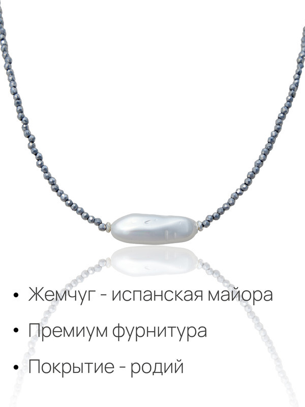 Гематит, жемчуг Майорка барочный, ювелирный сплав. Гальваническое покрытие: родий.