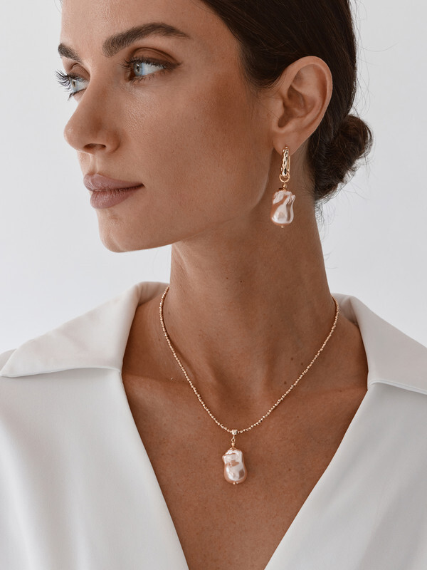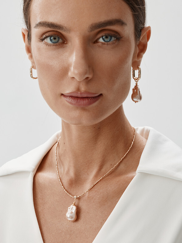 Марказит, барочный жемчуг Майорка, циркон, ювелирный сплав. Гальваническое покрытие: золото.