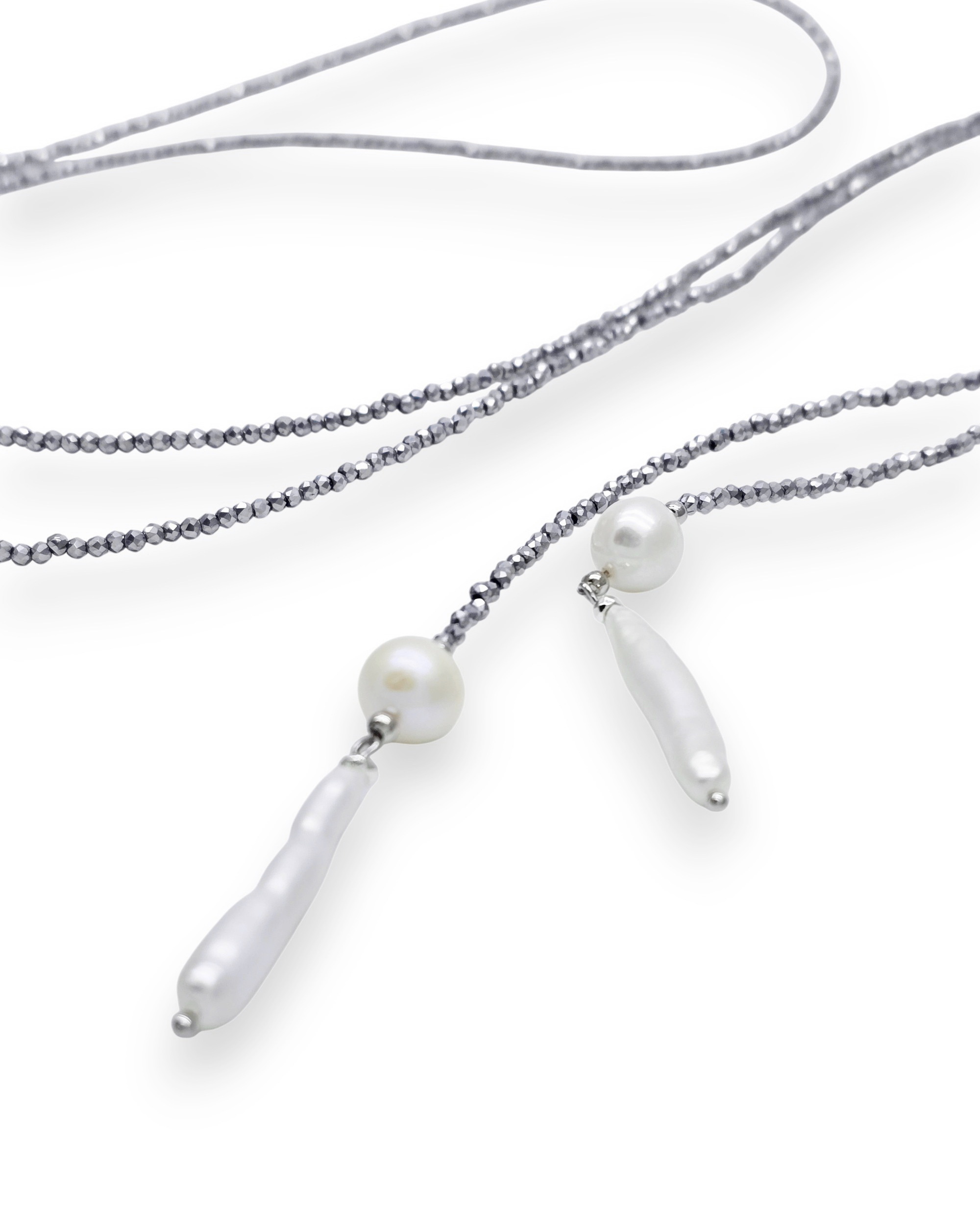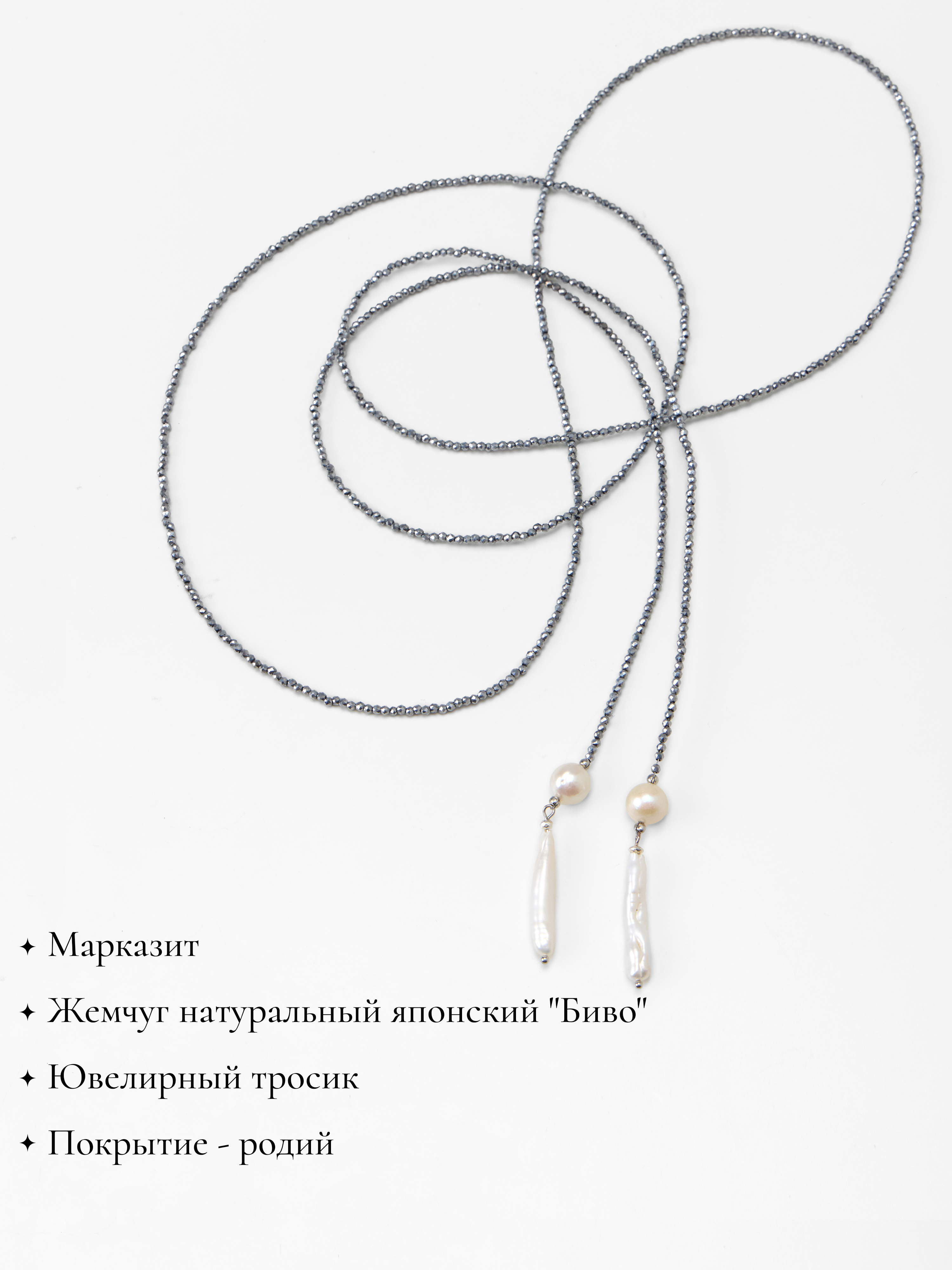 Размер: Длина колье 140 см. Жемчуг 9 - 11 мм, 5*25 мм, марказит 2 мм.