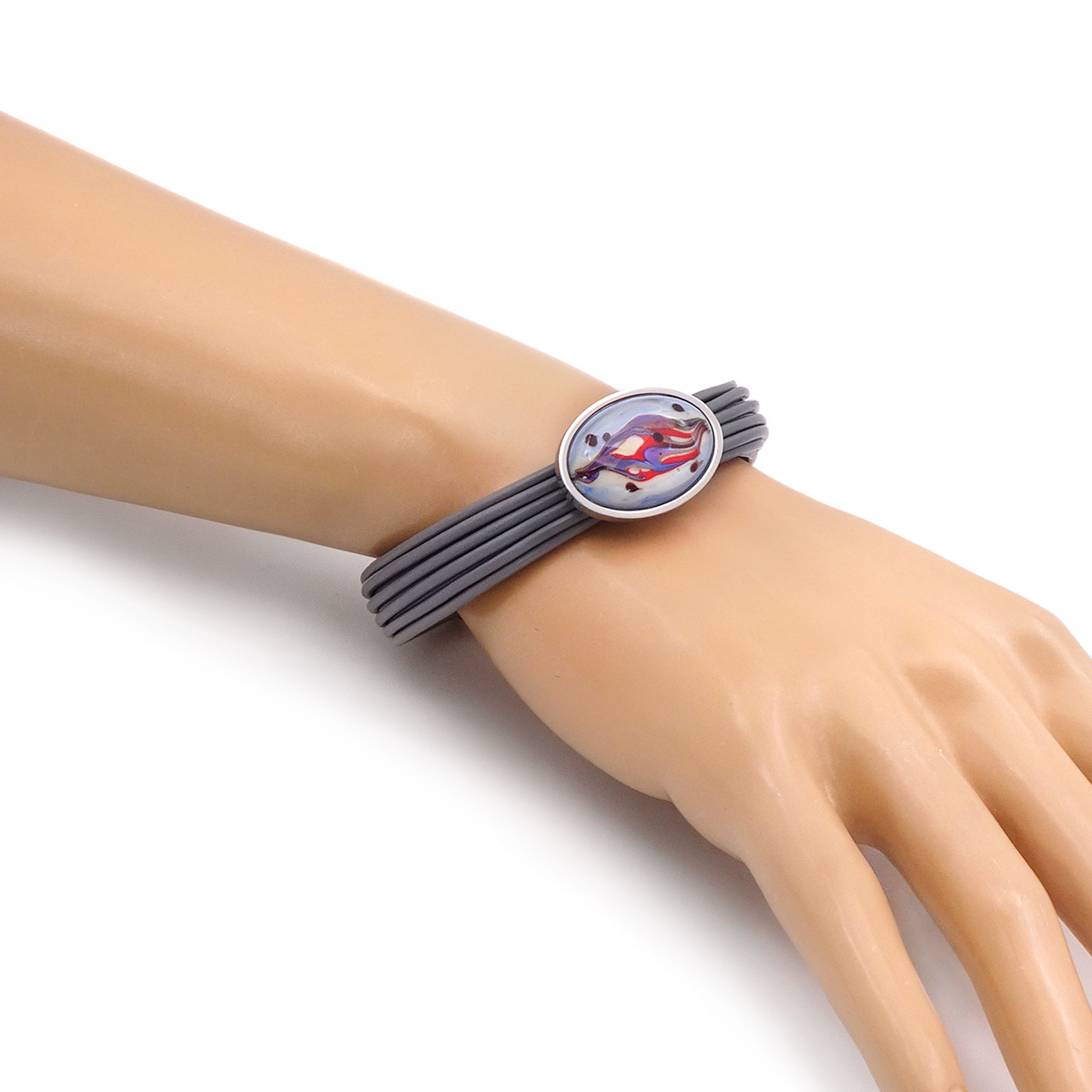 Браслет изготовлен из муранского стекла, натуральной кожи и гипоаллергенной ювелирной стали, что очень важно для людей с чувствительной кожей. Металл не темнеет и не подвергается воздействиям окружающей среды, надолго обеспечивая красивый внешний вид изделия. Крепкий магнитный замок с двойной защитой надежно фиксируется на запястье. Ширина браслета - 1,5 см. Размер стеклянного элемента - 1,9x2,6 см. Вес - 21 гр.