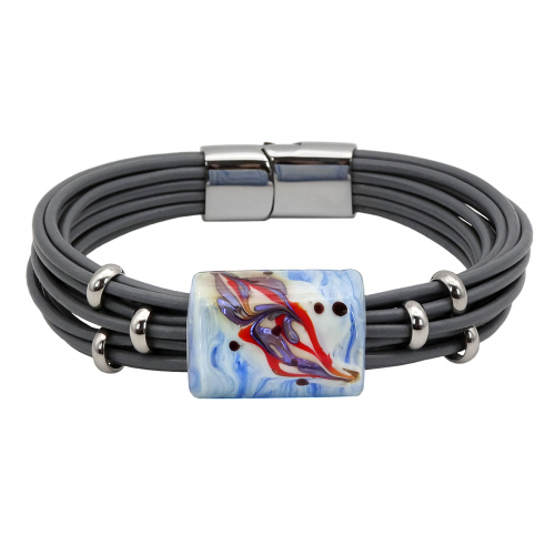 Браслет изготовлен из муранского стекла, натуральной кожи и гипоаллергенной ювелирной стали, что очень важно для людей с чувствительной кожей. Металл не темнеет и не подвергается воздействиям окружающей среды, надолго обеспечивая красивый внешний вид изделия. Крепкий магнитный замок с двойной защитой надежно фиксируется на запястье. Ширина браслета - 1,5 см. Размер стеклянной бусины - 1,9x2,5 см. Вес - 27 гр.