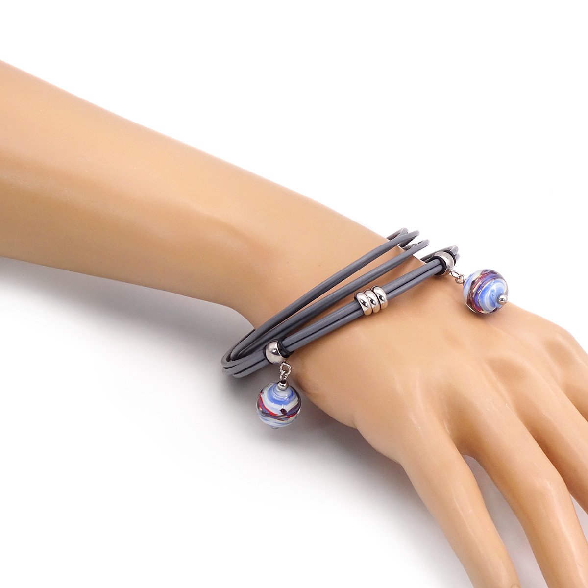 Браслет изготовлен из муранского стекла, натуральной кожи и гипоаллергенной ювелирной стали, что очень важно для людей с чувствительной кожей. Металл не темнеет и не подвергается воздействиям окружающей среды, надолго обеспечивая красивый внешний вид изделия. Крепкий магнитный замок надежно фиксируется на запястье. Ширина браслета - 1 см. Диаметр стеклянного шарика - 1,2 см. Вес - 13 гр.