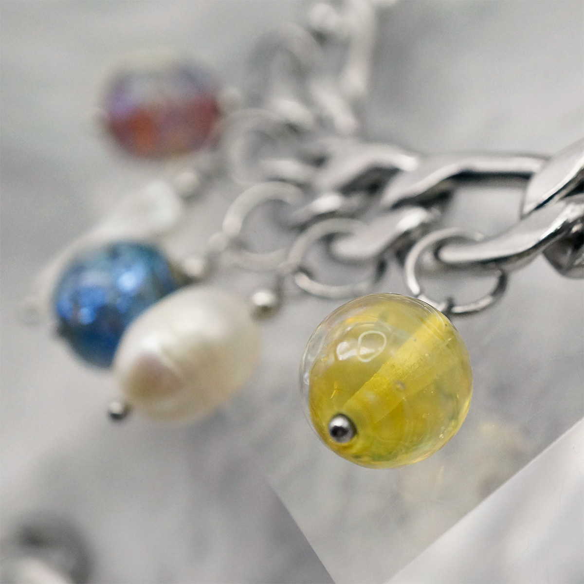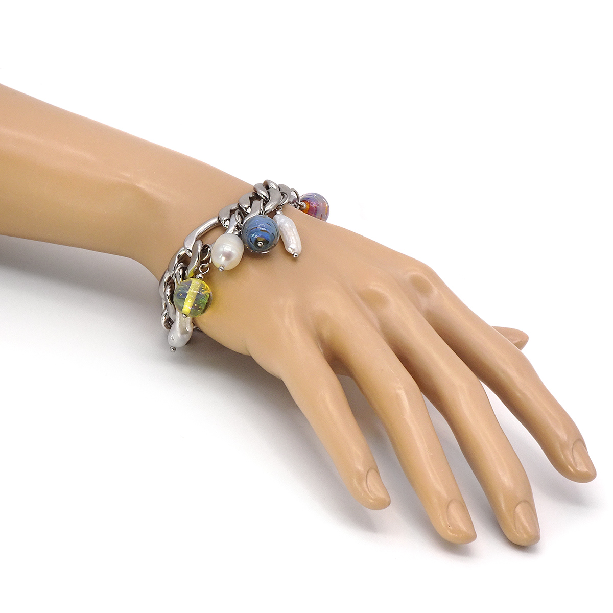 Браслет изготовлен из муранского стекла, натуральной кожи и гипоаллергенной ювелирной стали, что очень важно для людей с чувствительной кожей. Металл не темнеет и не подвергается воздействиям окружающей среды, надолго обеспечивая красивый внешний вид изделия. Длина браслета до карабина - 19 см + 5 см удлиняющая цепочка. Диаметр стеклянных шаров - 1,2 см. Вес - 45 гр.
