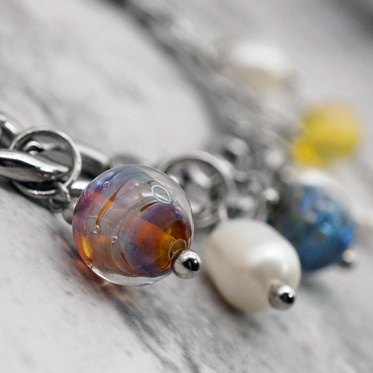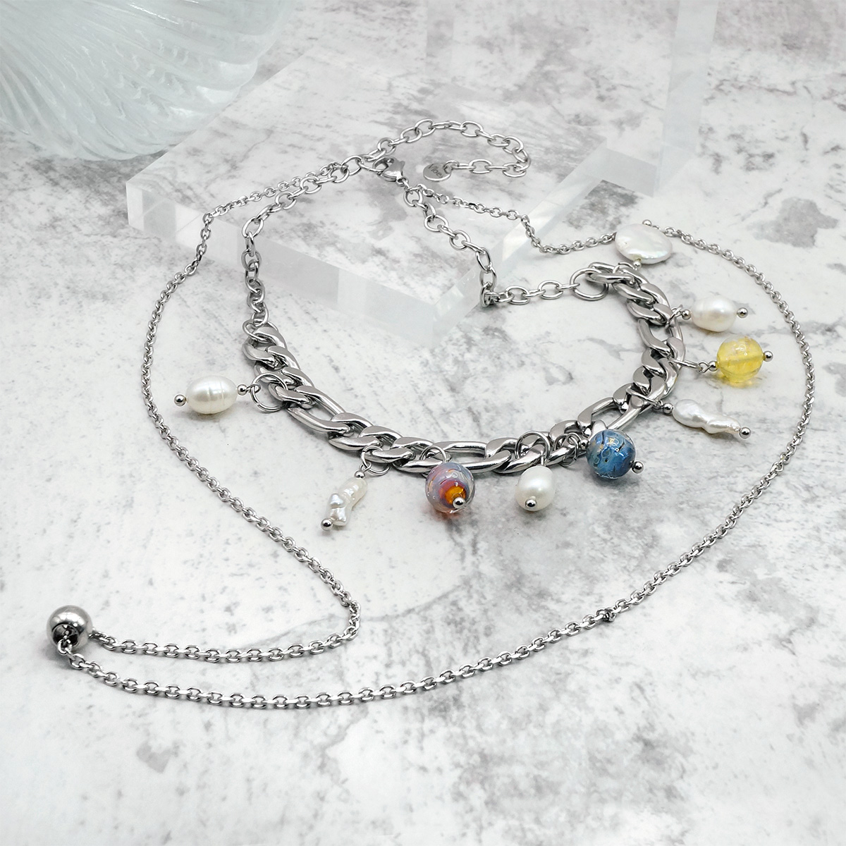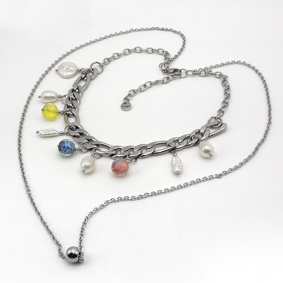 Колье изготовлено из муранского стекла и гипоаллергенной ювелирной стали, что очень важно для людей с чувствительной кожей. Металл не темнеет и не подвергается воздействиям окружающей среды, надолго обеспечивая красивый внешний вид изделия. Длина колье - 40.5 см + 5 см. удлиняющая цепочка, длина до нижней подвески - 74 см. Диаметр стеклянных шаров - 1,2 см. Вес - 73 гр.