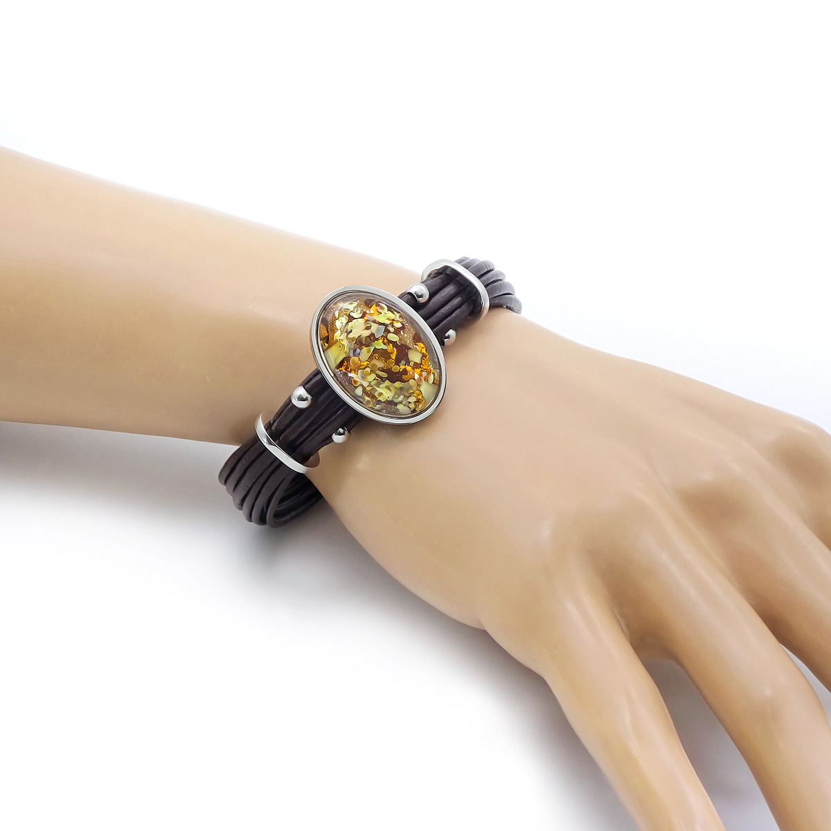 Браслет изготовлен из муранского стекла, натуральной кожи и гипоаллергенной ювелирной стали, что очень важно для людей с чувствительной кожей. Металл не темнеет и не подвергается воздействиям окружающей среды, надолго обеспечивая красивый внешний вид изделия. Крепкий магнитный замок с двойной защитой надежно фиксируется на запястье. Ширина браслета - 1,5 см. Размер стеклянного элемента - 1,9*2,6 см. Вес - 24 гр.