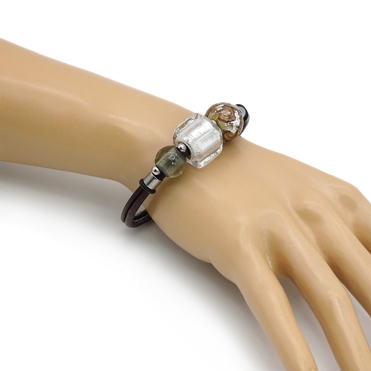Браслет изготовлен из муранского стекла, натуральной кожи и гипоаллергенной ювелирной стали, что очень важно для людей с чувствительной кожей. Металл не темнеет и не подвергается воздействиям окружающей среды, надолго обеспечивая красивый внешний вид изделия. Крепкий магнитный замок надежно фиксируется на запястье. Ширина браслета - 0,5 см. Диаметр стеклянных шароов - 1,2 и 1,5 см. Размер куба - 1,2х1,4 см. Вес - 26 гр.