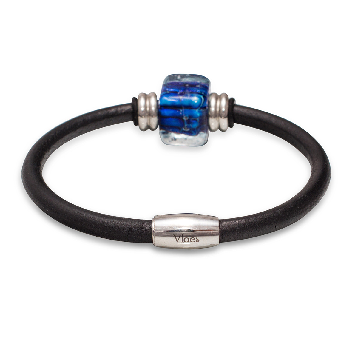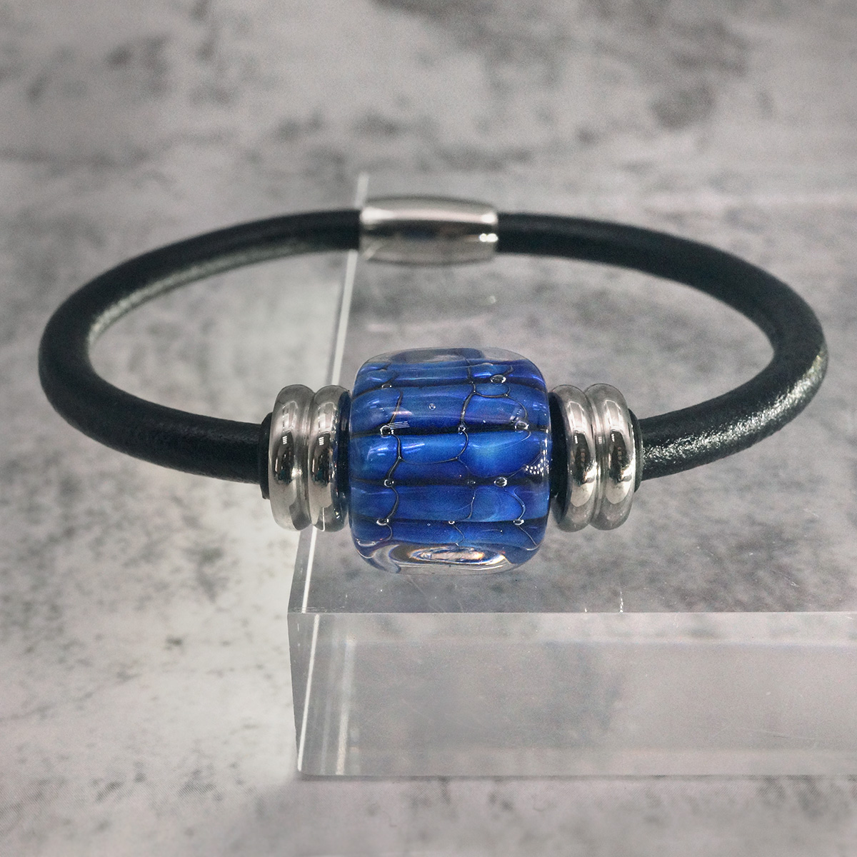 Браслет изготовлен из муранского стекла, натуральной кожи и гипоаллергенной ювелирной стали, что очень важно для людей с чувствительной кожей. Металл не темнеет и не подвергается воздействиям окружающей среды, надолго обеспечивая красивый внешний вид изделия. Крепкий магнитный замок надежно фиксируется на запястье. Ширина браслета - 0,5 см. Размер стеклянной бусины - 1,3x1,3 см. Вес - 14 гр.