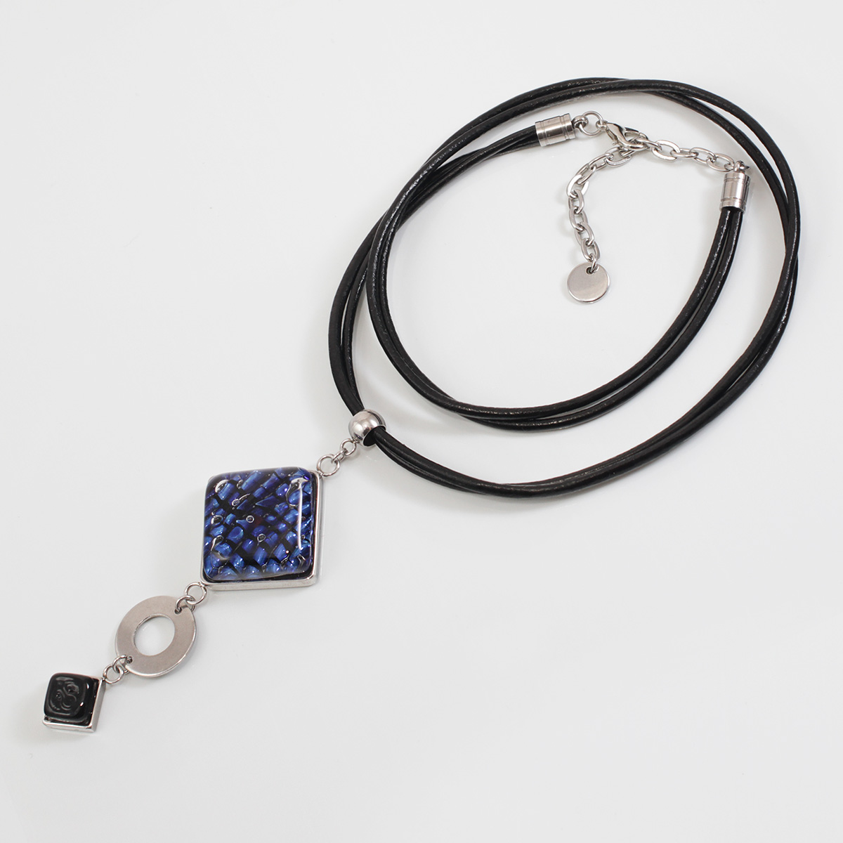 Колье изготовлено из натуральной кожи, муранского стекла и гипоаллергенной ювелирной стали, что очень важно для людей с чувствительной кожей. Металл не темнеет и не подвергается воздействиям окружающей среды, надолго обеспечивая красивый внешний вид изделия. Длина колье - 46 см + 5 см. удлиняющая цепочка. Длина кулона - 8,5 см. Размер стеклянного элемента - 3х3 и 1х1 см, диаметр шара 1,2 см. Вес - 26 гр.