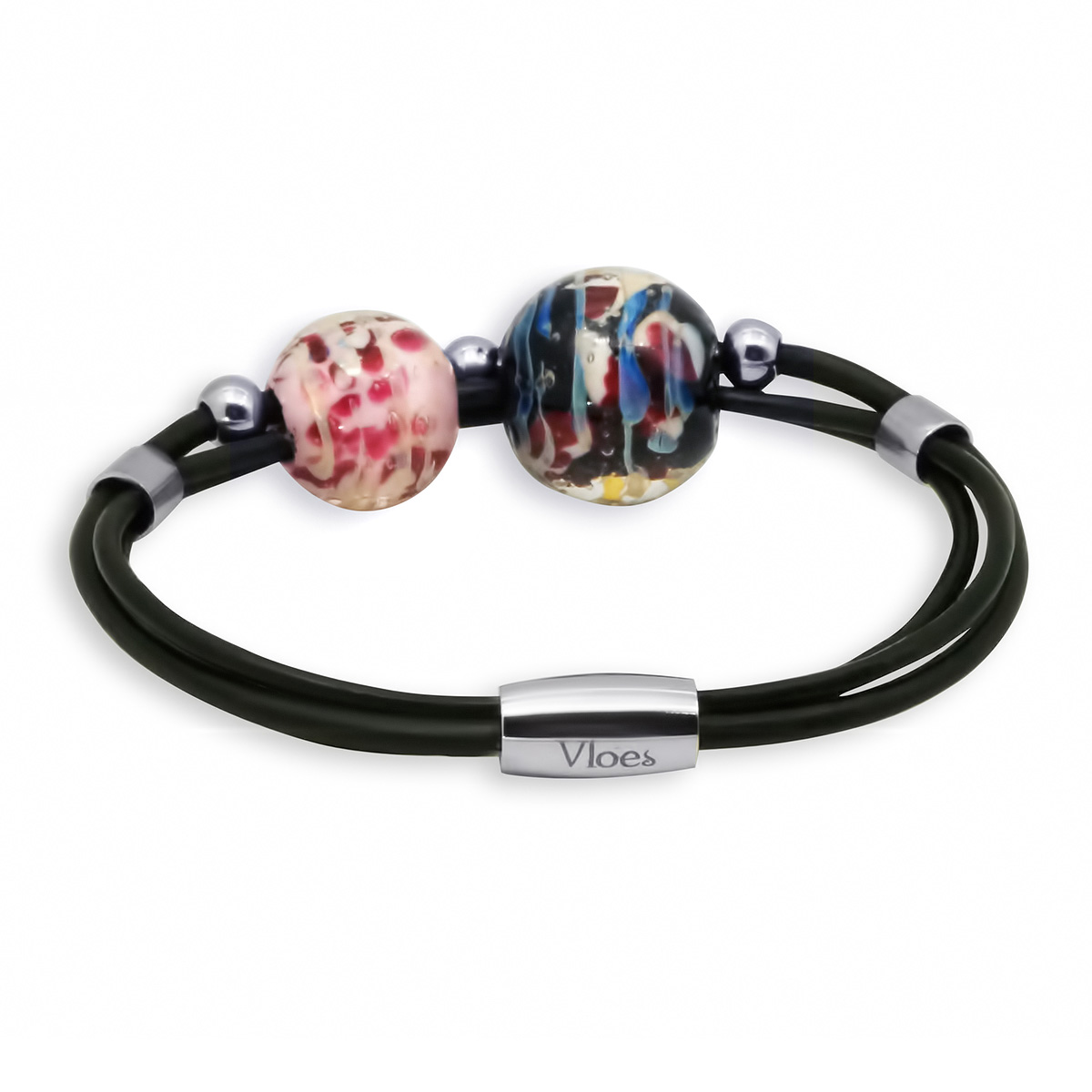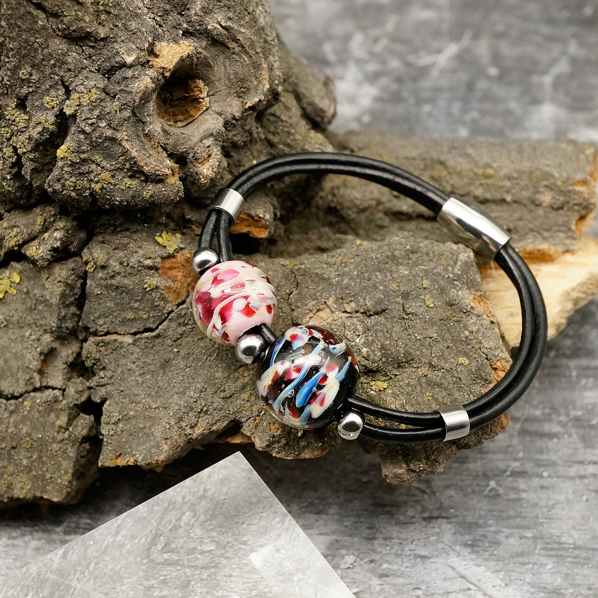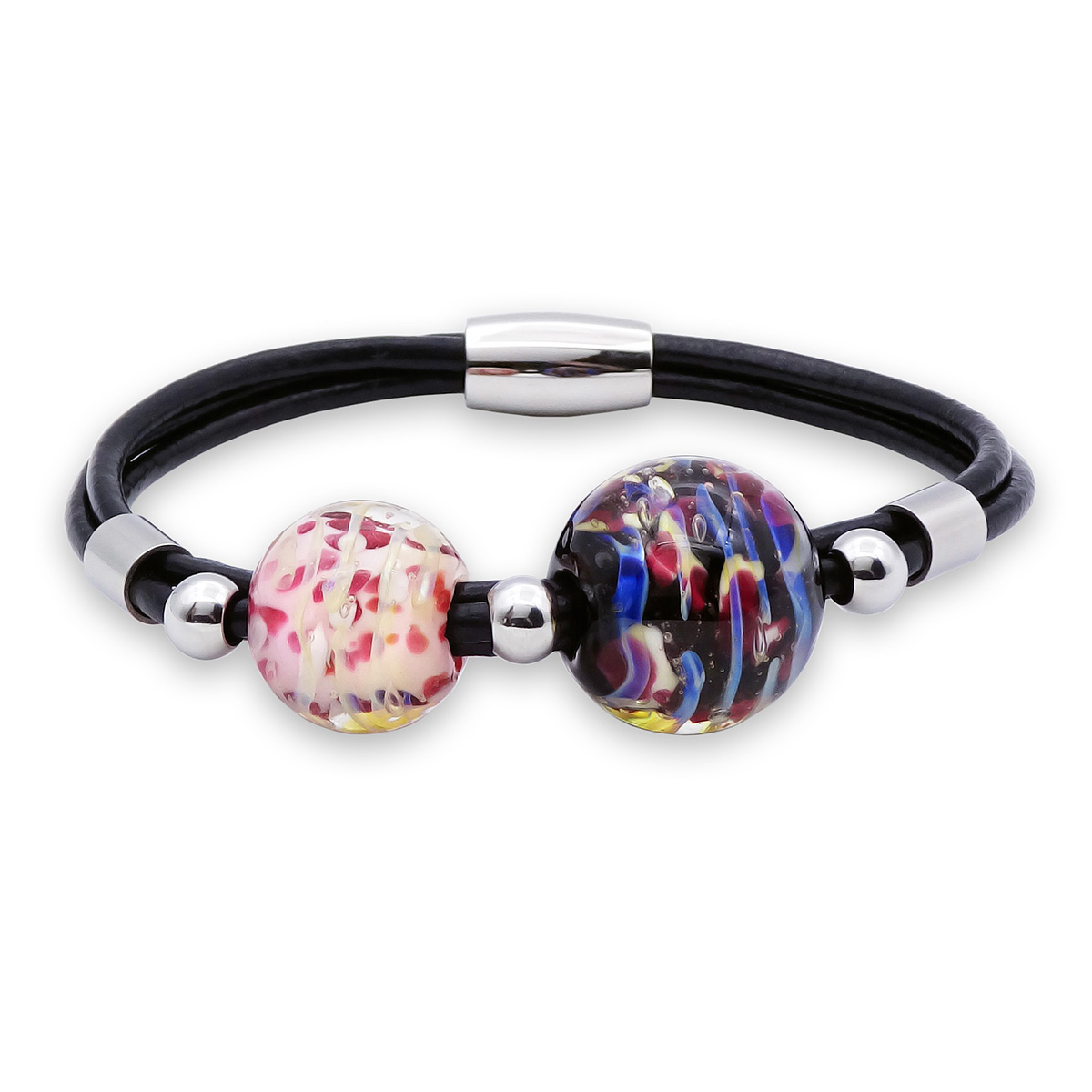 Браслет изготовлен из муранского стекла, натуральной кожи и гипоаллергенной ювелирной стали, что очень важно для людей с чувствительной кожей. Металл не темнеет и не подвергается воздействиям окружающей среды, надолго обеспечивая красивый внешний вид изделия. Крепкий магнитный замок надежно фиксируется на запястье. Ширина браслета - 0,5 см. Диаметр стеклянных шариков - 1,5 и 1,8 см. Вес - 20 гр.