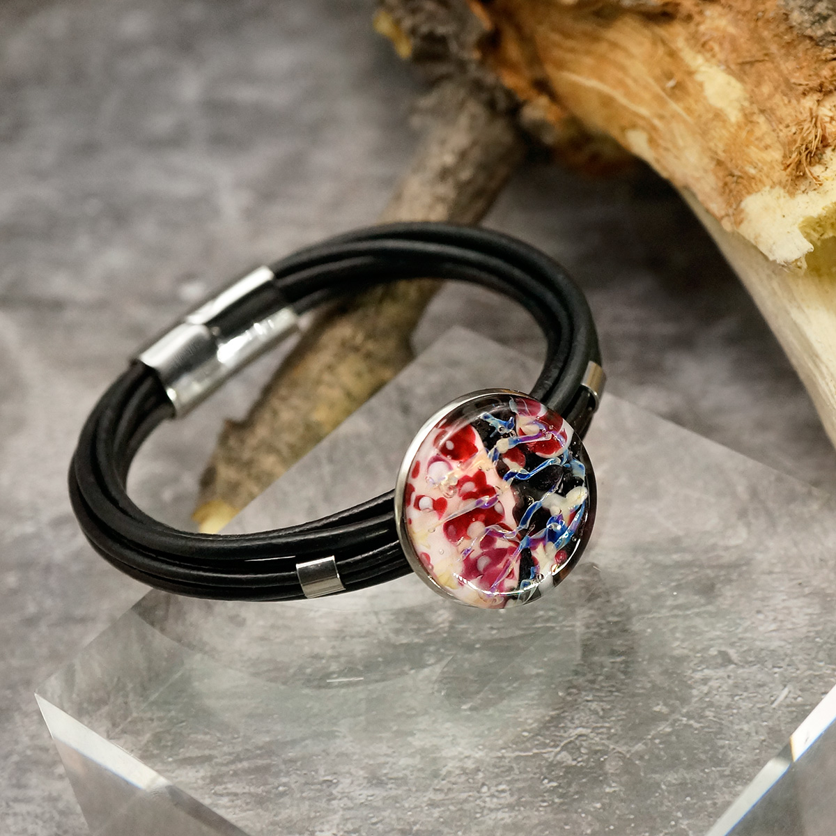 Браслет изготовлен из муранского стекла, натуральной кожи и гипоаллергенной ювелирной стали, что очень важно для людей с чувствительной кожей. Металл не темнеет и не подвергается воздействиям окружающей среды, надолго обеспечивая красивый внешний вид изделия. Крепкий магнитный замок с двойной защитой надежно фиксируется на запястье. Ширина браслета - 1,5 см. Диаметр стеклянного элемента - 2,5 см. Вес - 22 гр.