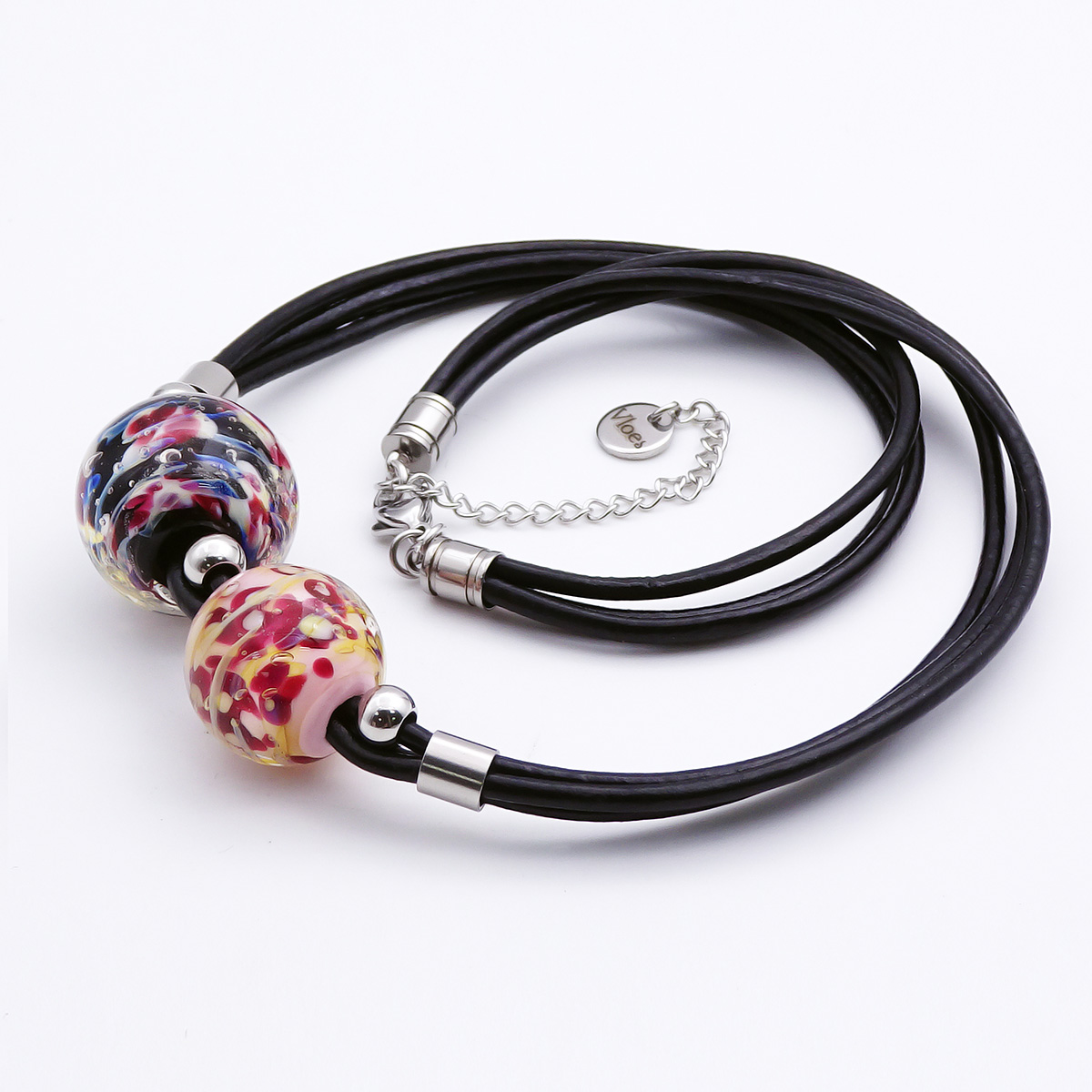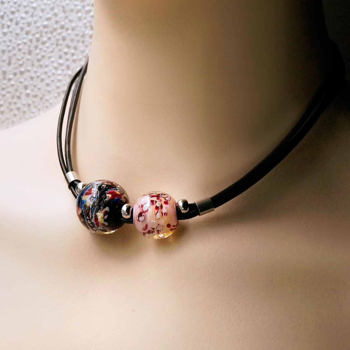 Колье изготовлено из натуральной кожи, муранского стекла и гипоаллергенной ювелирной стали, что очень важно для людей с чувствительной кожей. Металл не темнеет и не подвергается воздействиям окружающей среды, надолго обеспечивая красивый внешний вид изделия. Длина колье - 46 см + 5 см. удлиняющая цепочка. Диаметр стеклянных шаров - 1,8 и 2,2 см. Вес - 31 гр.