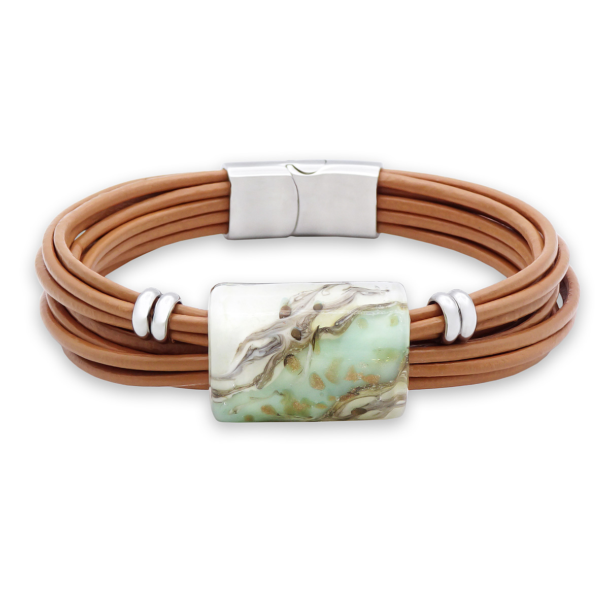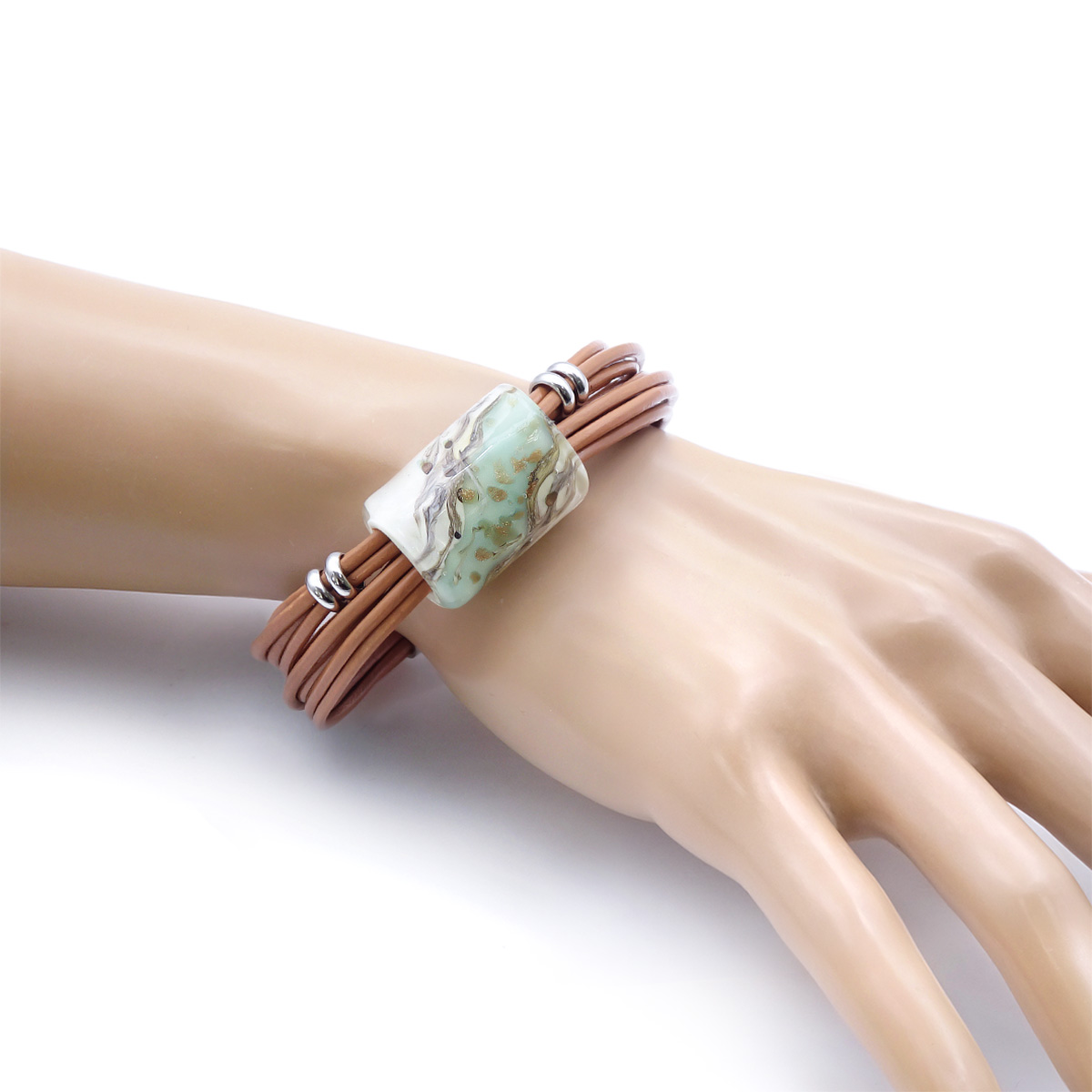 Браслет изготовлен из муранского стекла, натуральной кожи и гипоаллергенной ювелирной стали, что очень важно для людей с чувствительной кожей. Металл не темнеет и не подвергается воздействиям окружающей среды, надолго обеспечивая красивый внешний вид изделия. Крепкий магнитный замок с двойной защитой надежно фиксируется на запястье. Ширина браслета - 1,5 см. Размер стеклянной бусины - 1,9x2,5 см. Вес - 29 гр.