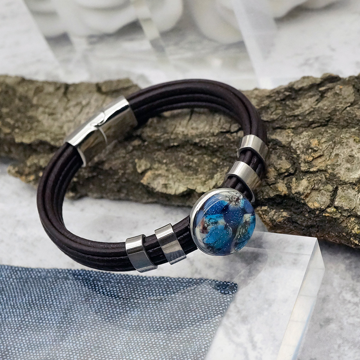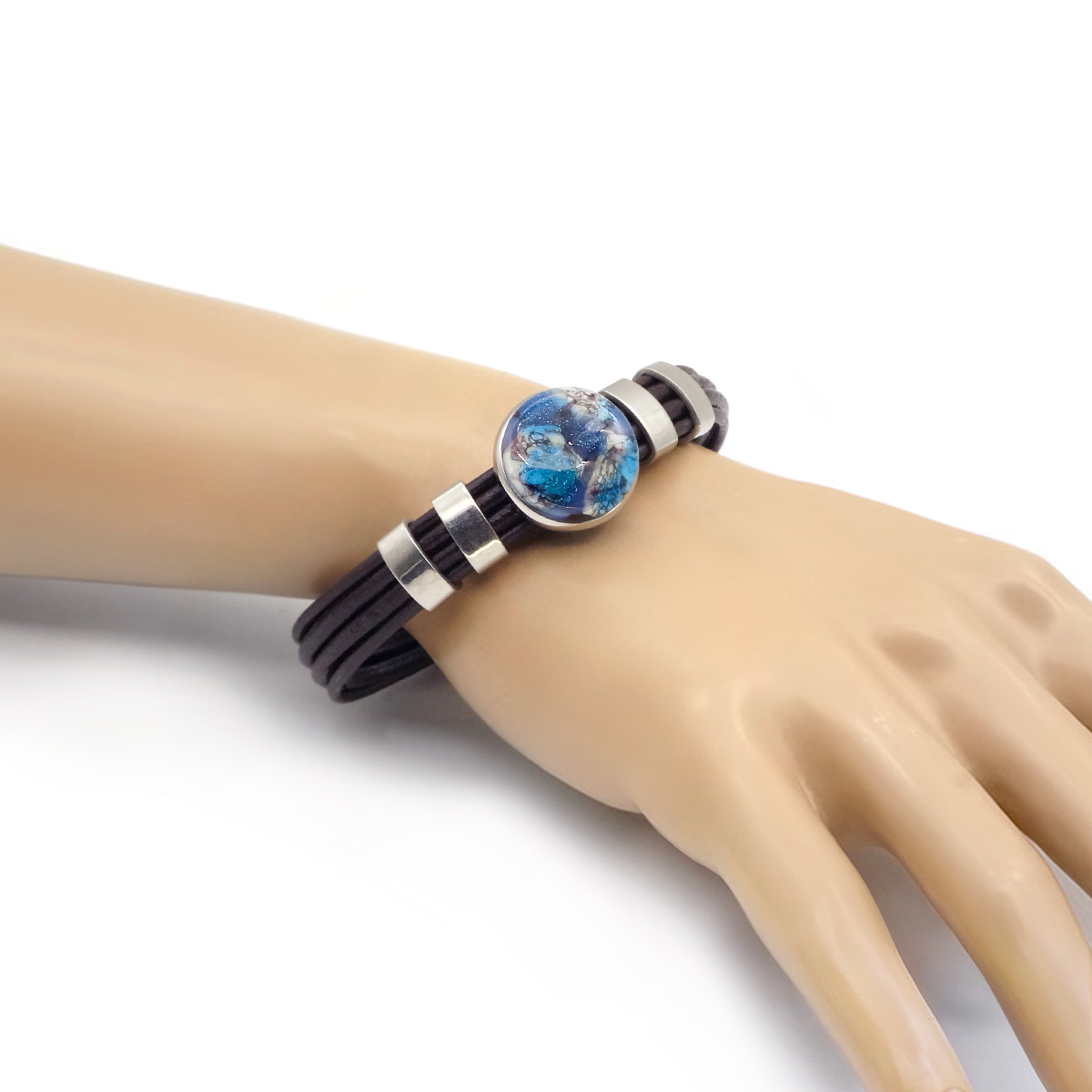Браслет изготовлен из муранского стекла, натуральной кожи и гипоаллергенной ювелирной стали, что очень важно для людей с чувствительной кожей. Металл не темнеет и не подвергается воздействиям окружающей среды, надолго обеспечивая красивый внешний вид изделия. Крепкий магнитный замок с двойной защитой надежно фиксируется на запястье. Ширина браслета - 1,5 см. Диаметр стеклянного элемента - 2 см. Вес -  29 гр.