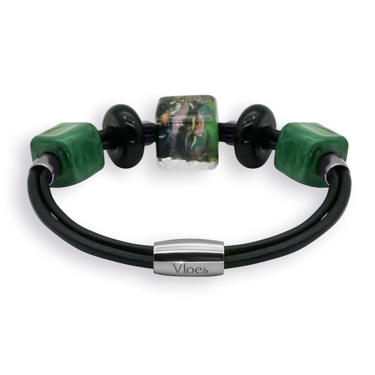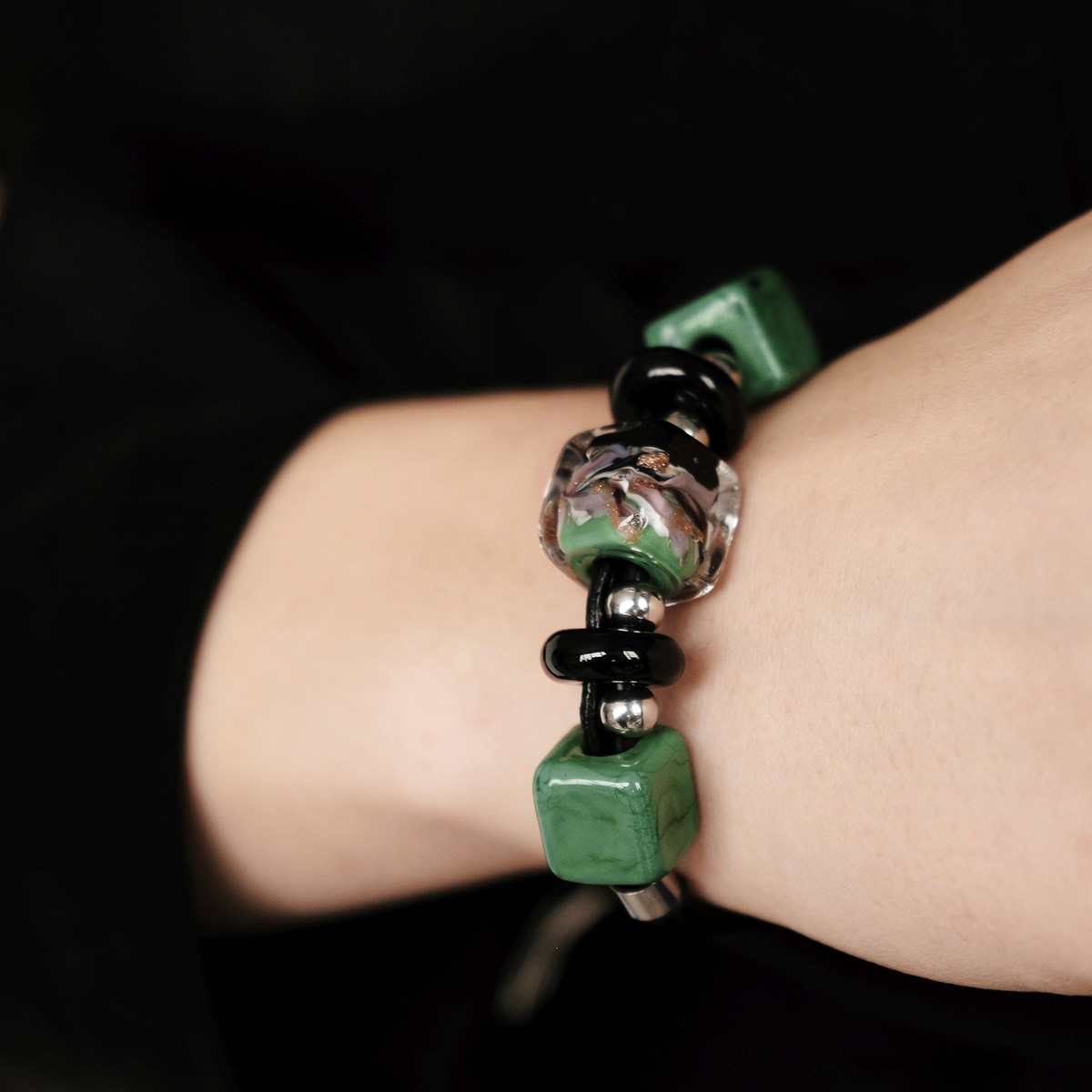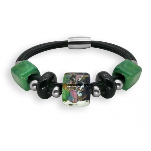 Браслет изготовлен из муранского стекла, натуральной кожи и гипоаллергенной ювелирной стали, что очень важно для людей с чувствительной кожей. Металл не темнеет и не подвергается воздействиям окружающей среды, надолго обеспечивая красивый внешний вид изделия. Крепкий магнитный замок надежно фиксируется на запястье. Ширина браслета - 0,5 см. Размер стеклянных кубов - 1,5*1,5 и 1,2*1,2см. Размер стеклянных бусин - 1*0,5 см. Вес - 25 гр.