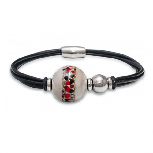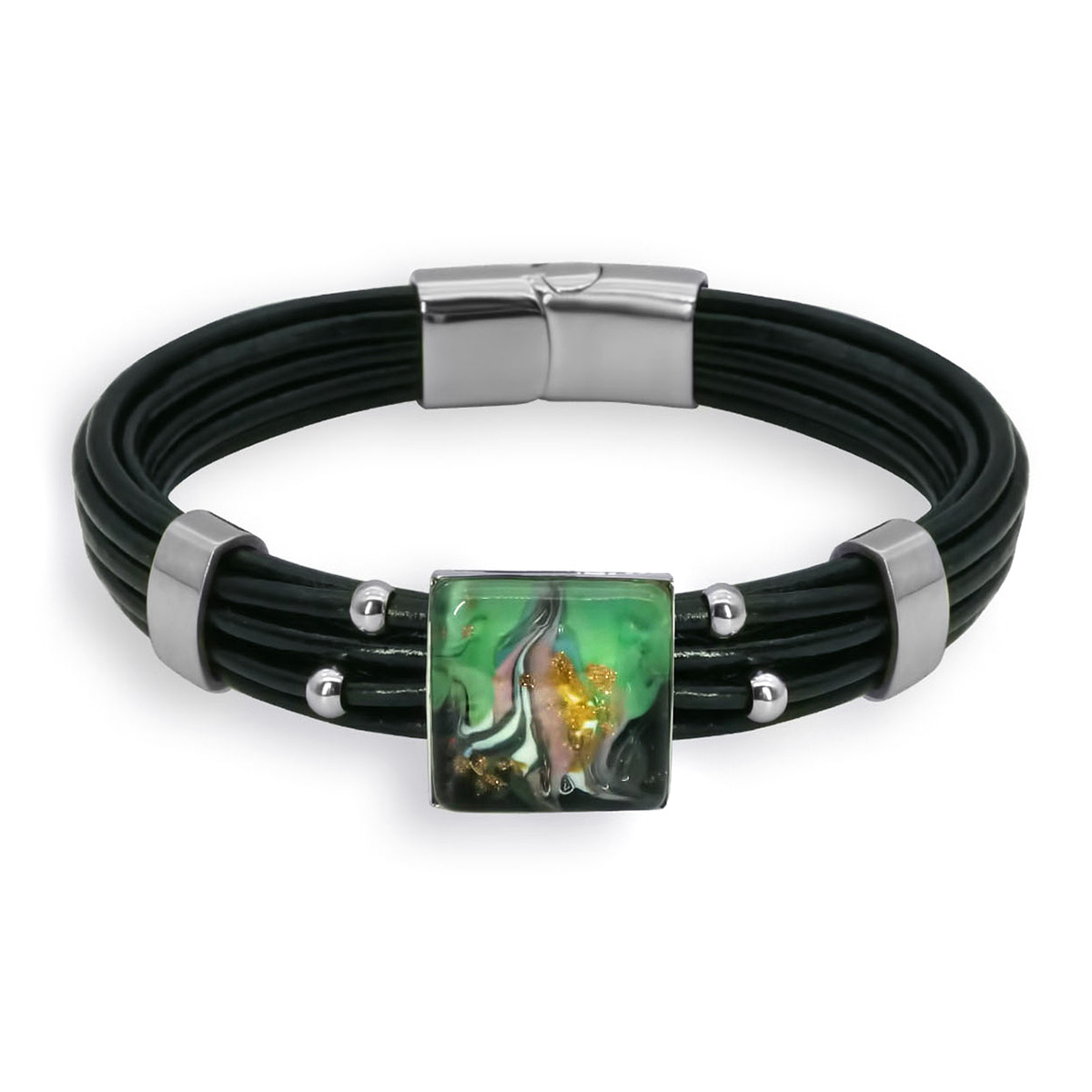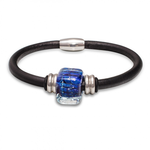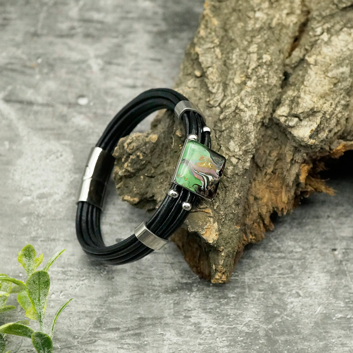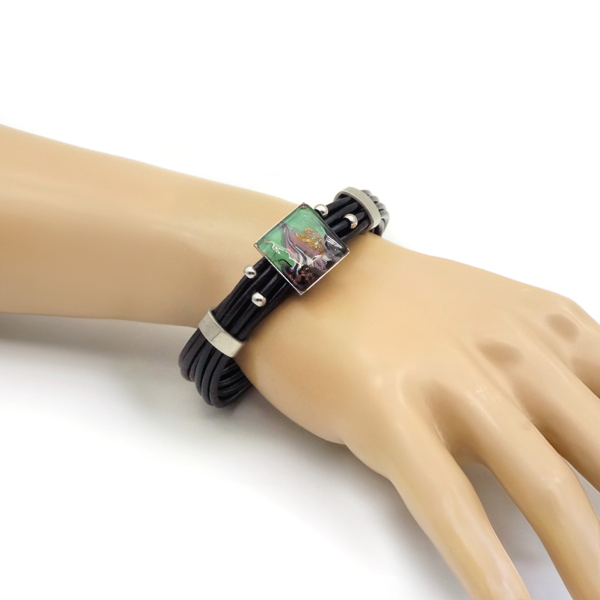 Браслет изготовлен из муранского стекла, натуральной кожи и гипоаллергенной ювелирной стали, что очень важно для людей с чувствительной кожей. Металл не темнеет и не подвергается воздействиям окружающей среды, надолго обеспечивая красивый внешний вид изделия. Крепкий магнитный замок с двойной защитой надежно фиксируется на запястье. Ширина браслета - 1,5 см. Размер стеклянного элемента - 1,6*1,6 см. Вес - 23 гр.