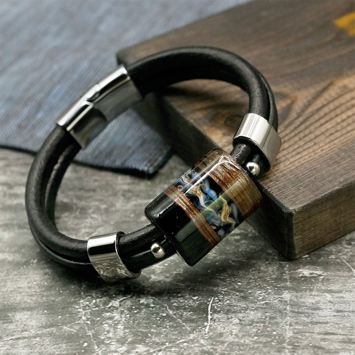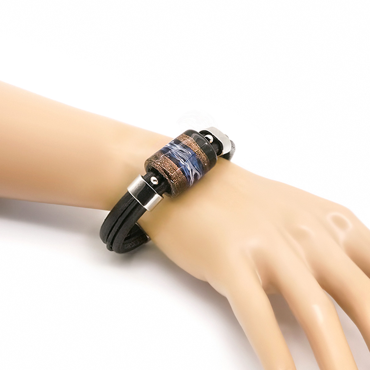 Браслет изготовлен из муранского стекла, натуральной кожи и гипоаллергенной ювелирной стали, что очень важно для людей с чувствительной кожей. Металл не темнеет и не подвергается воздействиям окружающей среды, надолго обеспечивая красивый внешний вид изделия. Крепкий магнитный замок с двойной защитой надежно фиксируется на запястье. Ширина браслета - 1,5 см. Размер стеклянной бусины - 1,9x2,5 см. Вес - 30 гр.