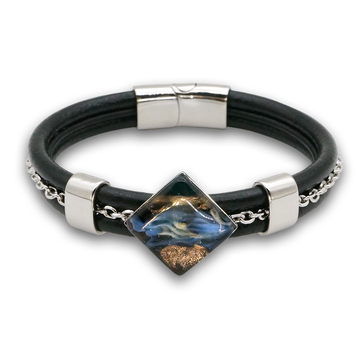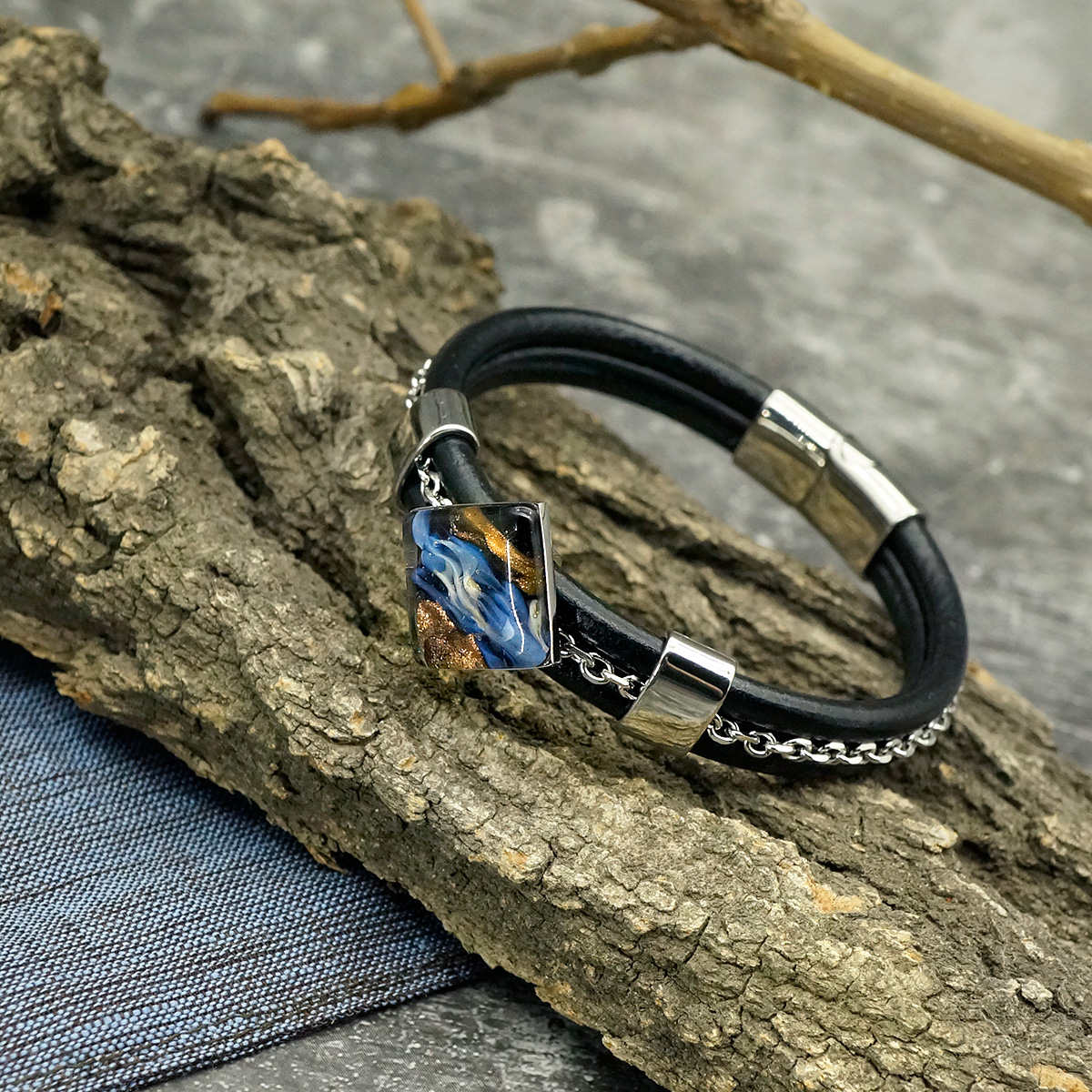 Браслет изготовлен из муранского стекла, натуральной кожи и гипоаллергенной ювелирной стали, что очень важно для людей с чувствительной кожей. Металл не темнеет и не подвергается воздействиям окружающей среды, надолго обеспечивая красивый внешний вид изделия. Крепкий магнитный замок с двойной защитой надежно фиксируется на запястье. Ширина браслета - 1,5 см. Размер стеклянного элемента - 2,3x2,3 см. Вес - 26 гр.