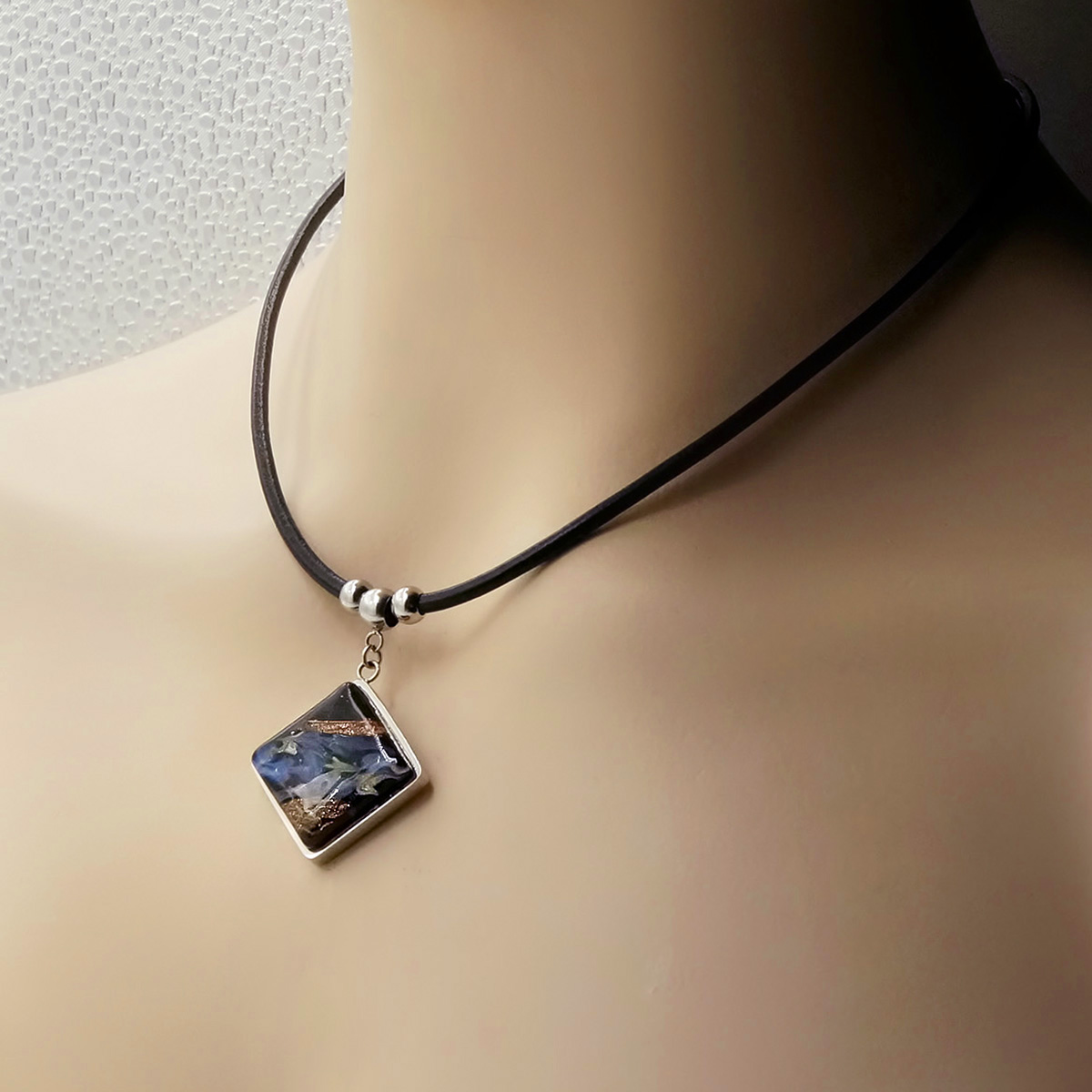 Колье изготовлено из натуральной кожи, муранского стекла и гипоаллергенной ювелирной стали, что очень важно для людей с чувствительной кожей. Металл не темнеет и не подвергается воздействиям окружающей среды, надолго обеспечивая красивый внешний вид изделия. Длина колье - 46 см + 5 см. удлиняющая цепочка. Размер стеклянного элемента - 3х3 см. Вес -  19 гр.