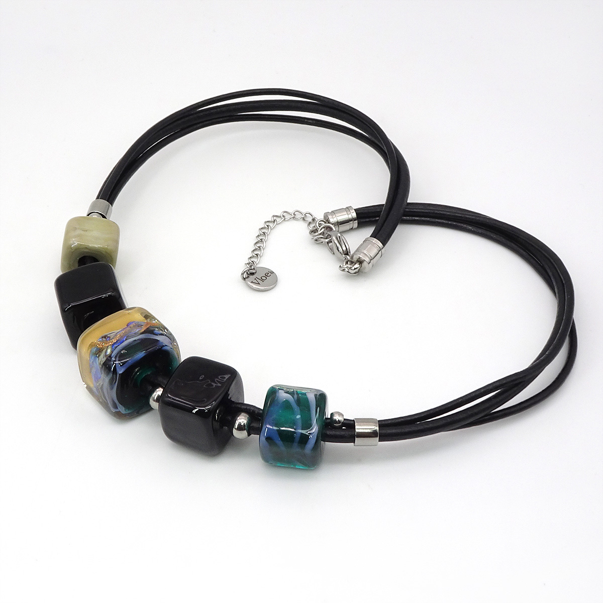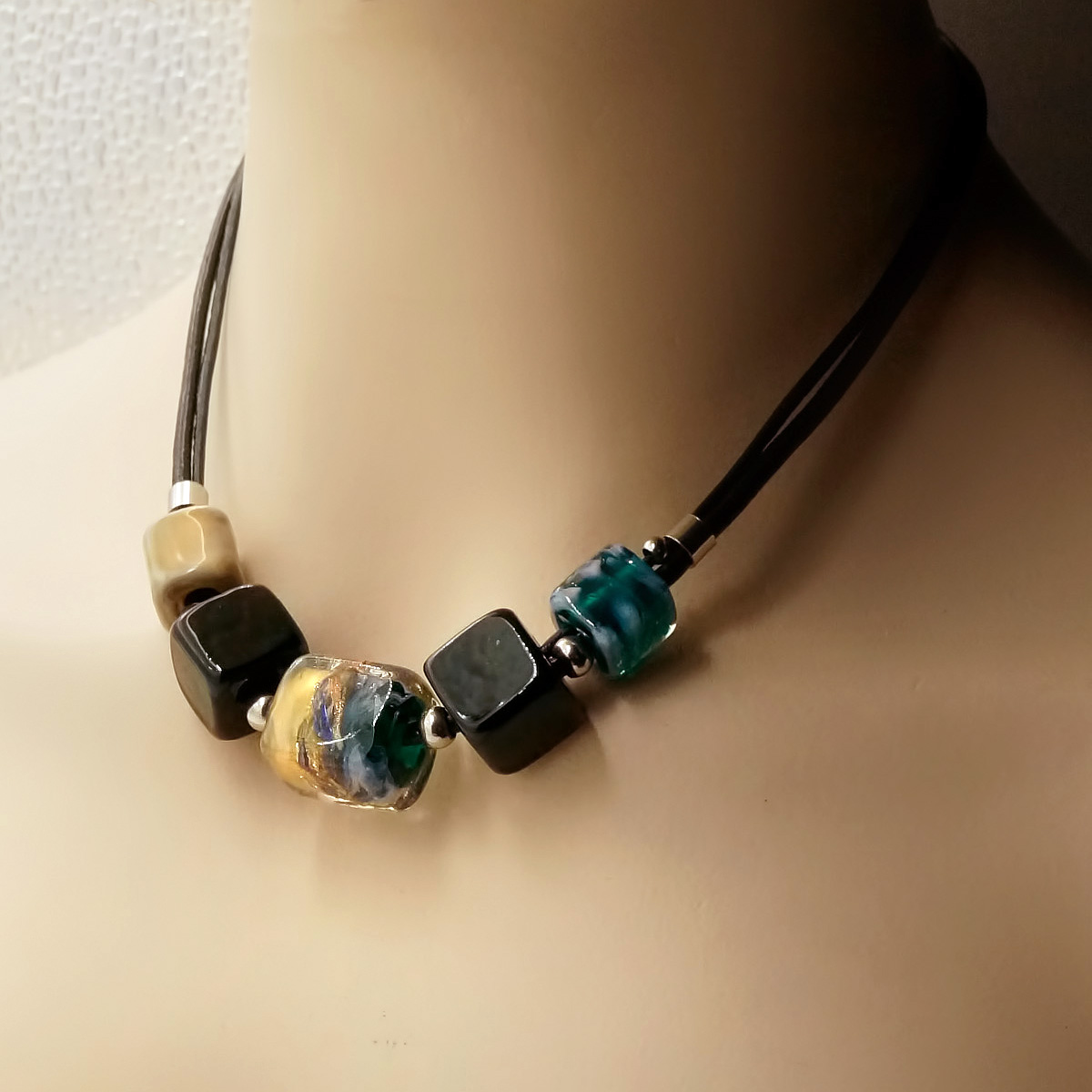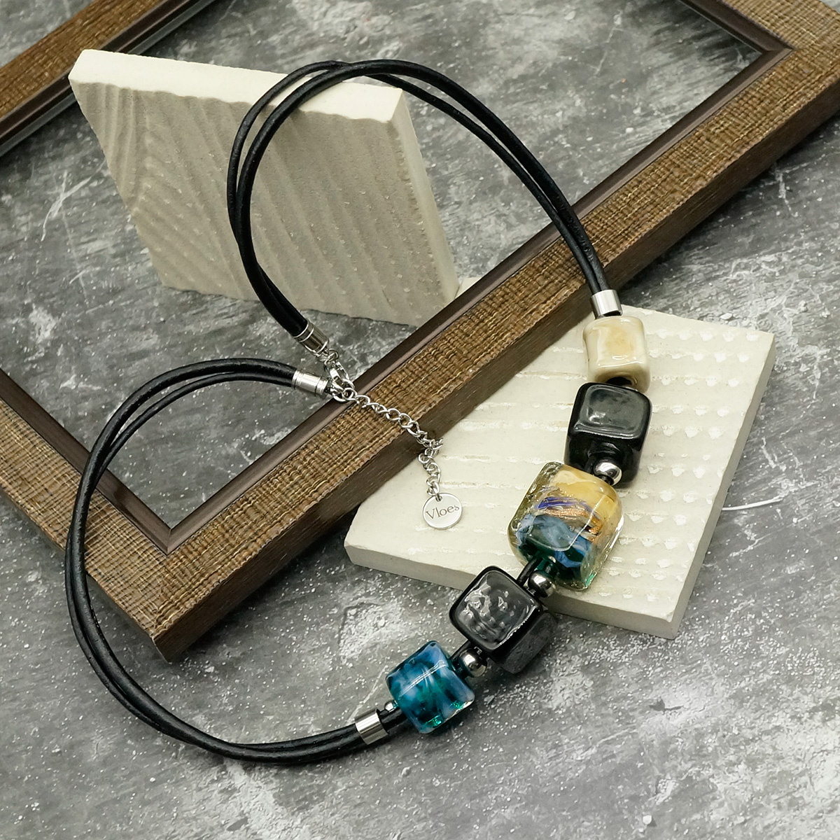 Колье изготовлено из натуральной кожи, муранского стекла и гипоаллергенной ювелирной стали, что очень важно для людей с чувствительной кожей. Металл не темнеет и не подвергается воздействиям окружающей среды, надолго обеспечивая красивый внешний вид изделия. Длина колье - 46 см + 5 см. удлиняющая цепочка. Размер стеклянных бусин - 1,6х1,6; 1,4х1,4 и 1,3х1,3 см. Вес - 47 гр.