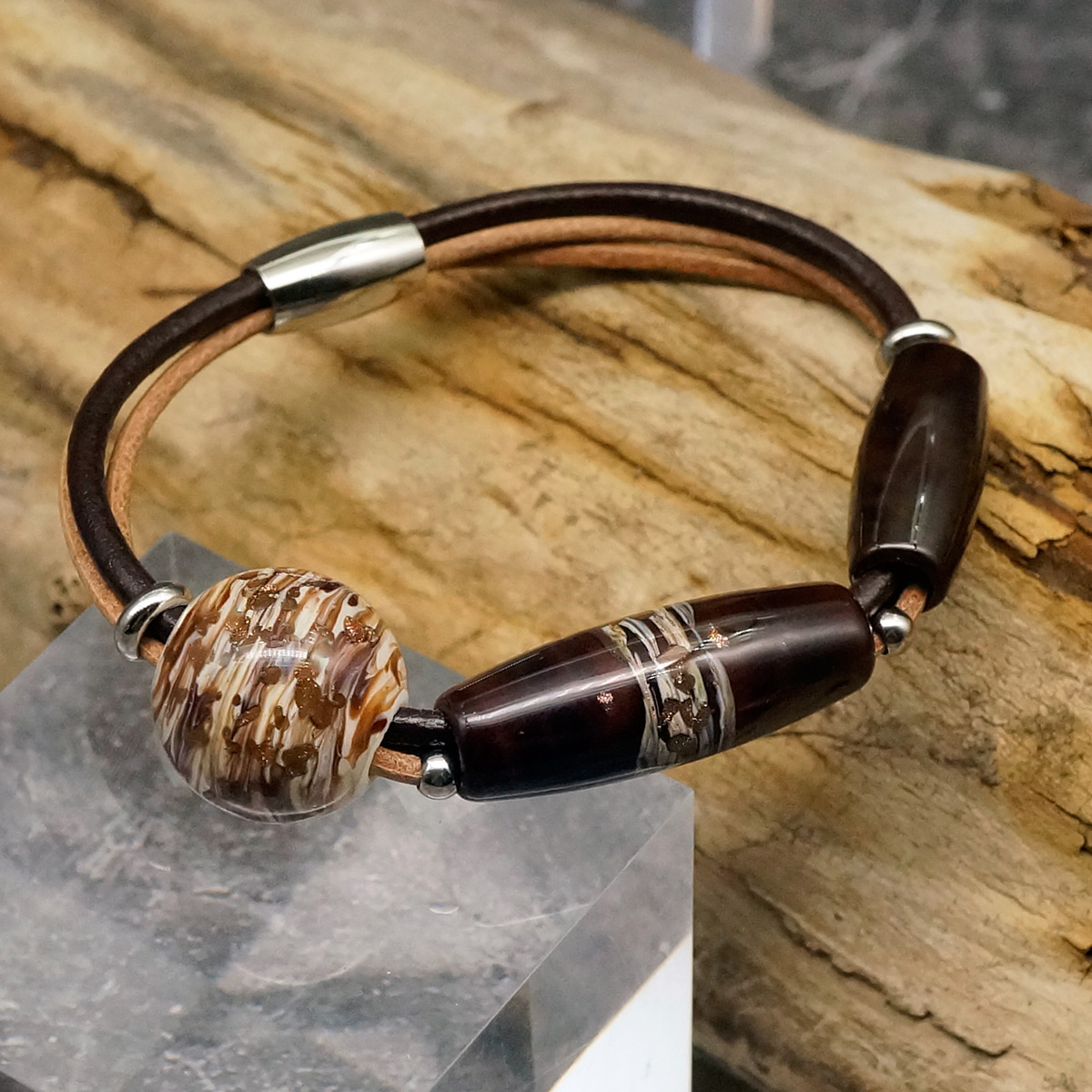 Браслет изготовлен из муранского стекла, натуральной кожи и гипоаллергенной ювелирной стали, что очень важно для людей с чувствительной кожей. Металл не темнеет и не подвергается воздействиям окружающей среды, надолго обеспечивая красивый внешний вид изделия. Крепкий магнитный замок надежно фиксируется на запястье. Ширина браслета - 0,5 см. Размер стеклянных бусин - 2 см и 3,5 см, диаметр шара 1,8 см. Вес - 23 гр.