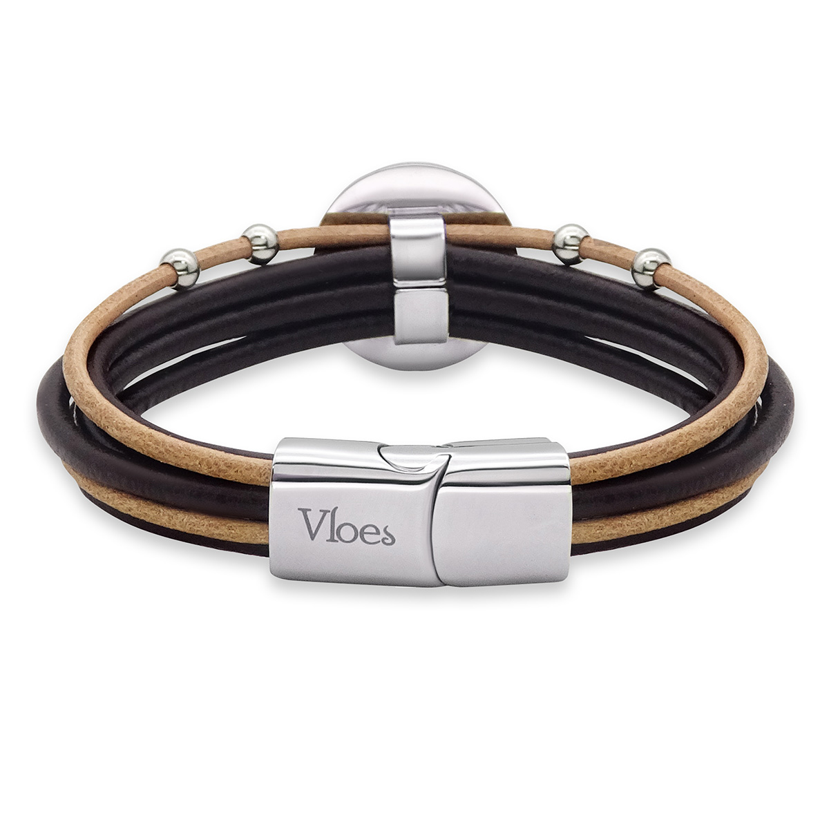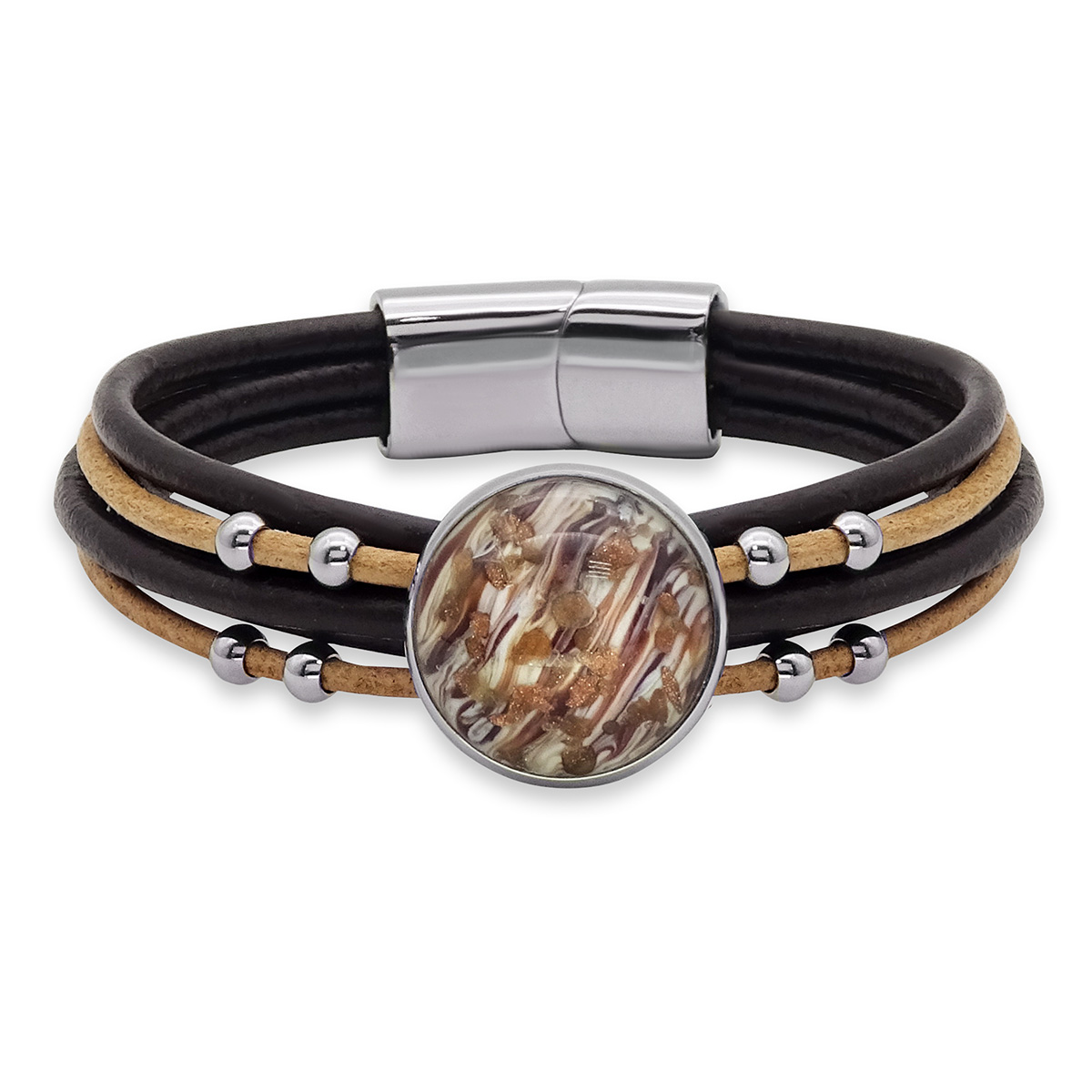 Браслет изготовлен из муранского стекла, натуральной кожи и гипоаллергенной ювелирной стали, что очень важно для людей с чувствительной кожей. Металл не темнеет и не подвергается воздействиям окружающей среды, надолго обеспечивая красивый внешний вид изделия. Крепкий магнитный замок с двойной защитой надежно фиксируется на запястье. Ширина браслета - 1,5 см. Диаметр стеклянного элемента - 2,5 см. Вес - 24 гр.