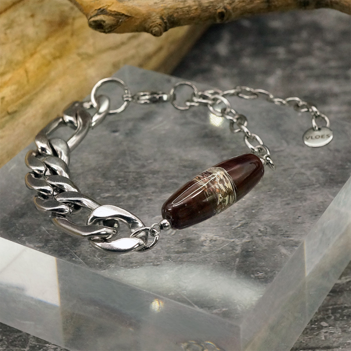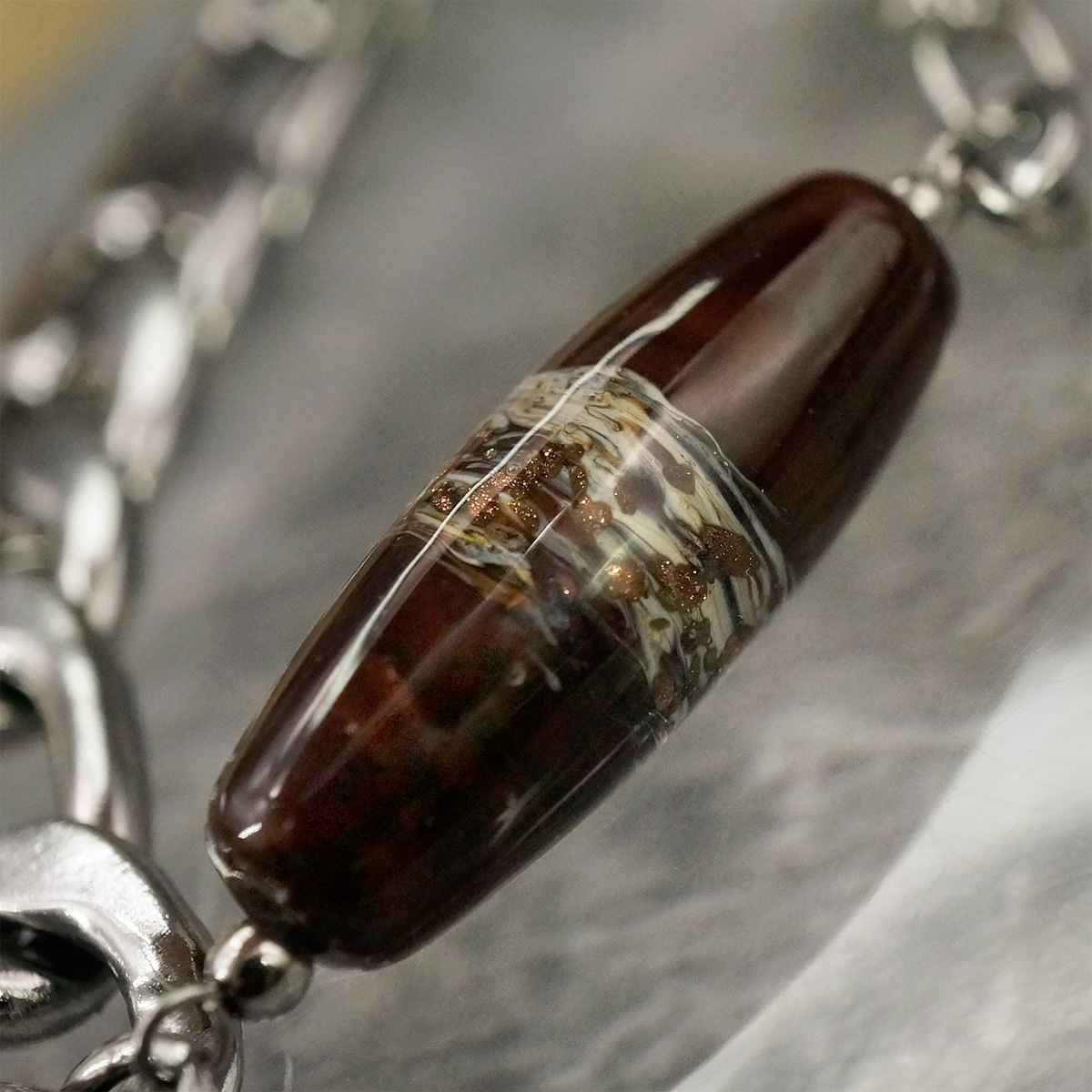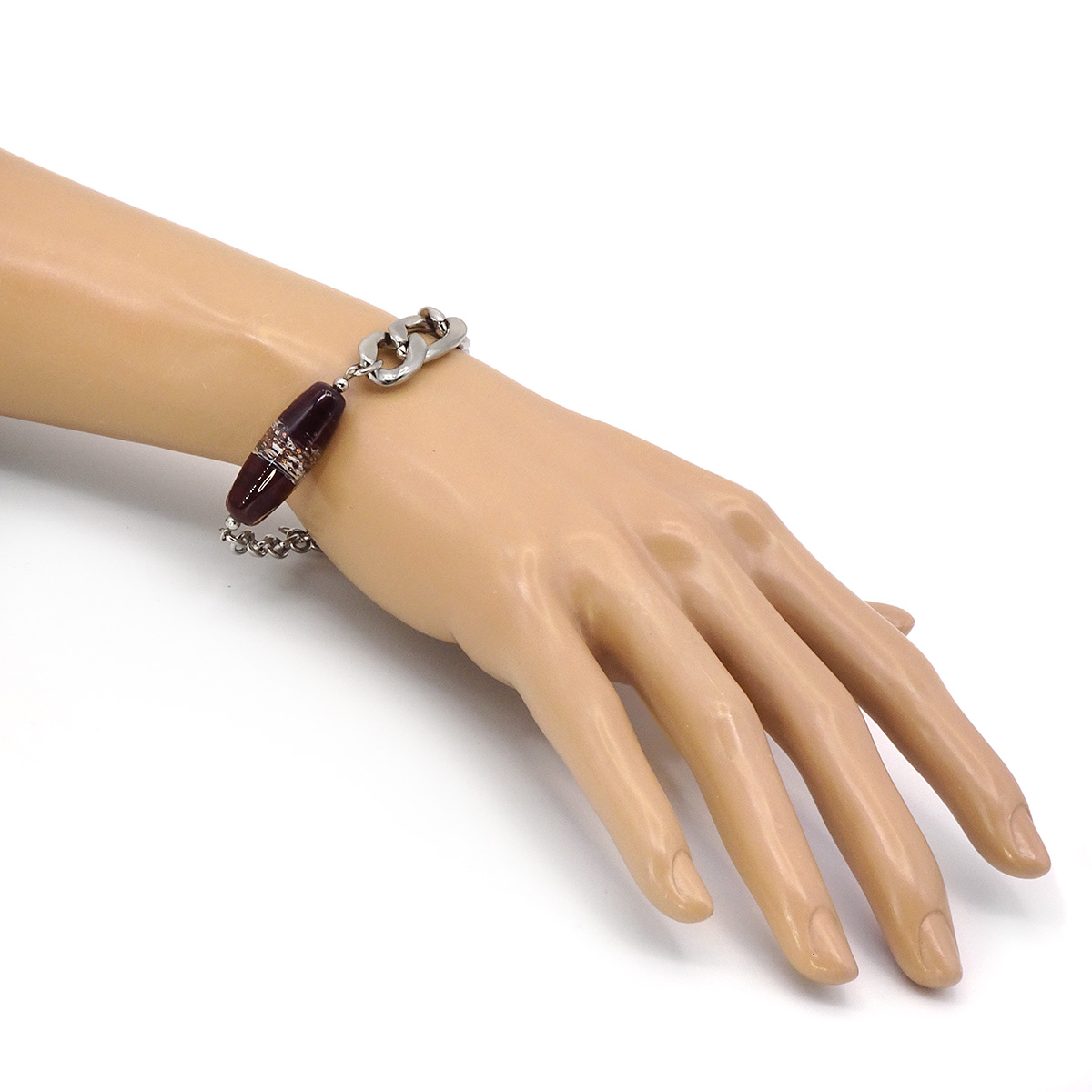Браслет изготовлен из муранского стекла и гипоаллергенной ювелирной стали, что очень важно для людей с чувствительной кожей. Металл не темнеет и не подвергается воздействиям окружающей среды, надолго обеспечивая красивый внешний вид изделия. Размер стеклянной бусины - 3 см. Вес - 23 гр.