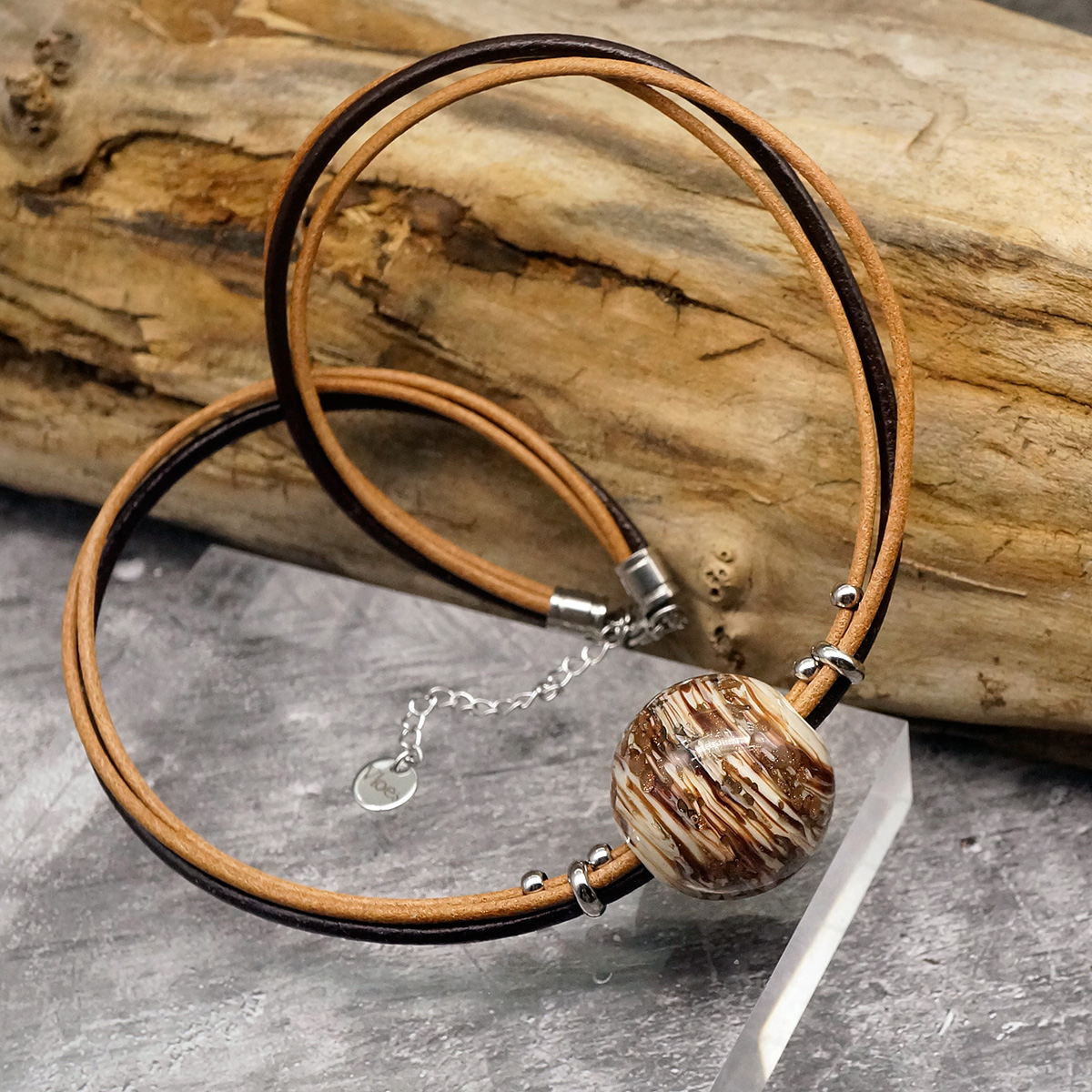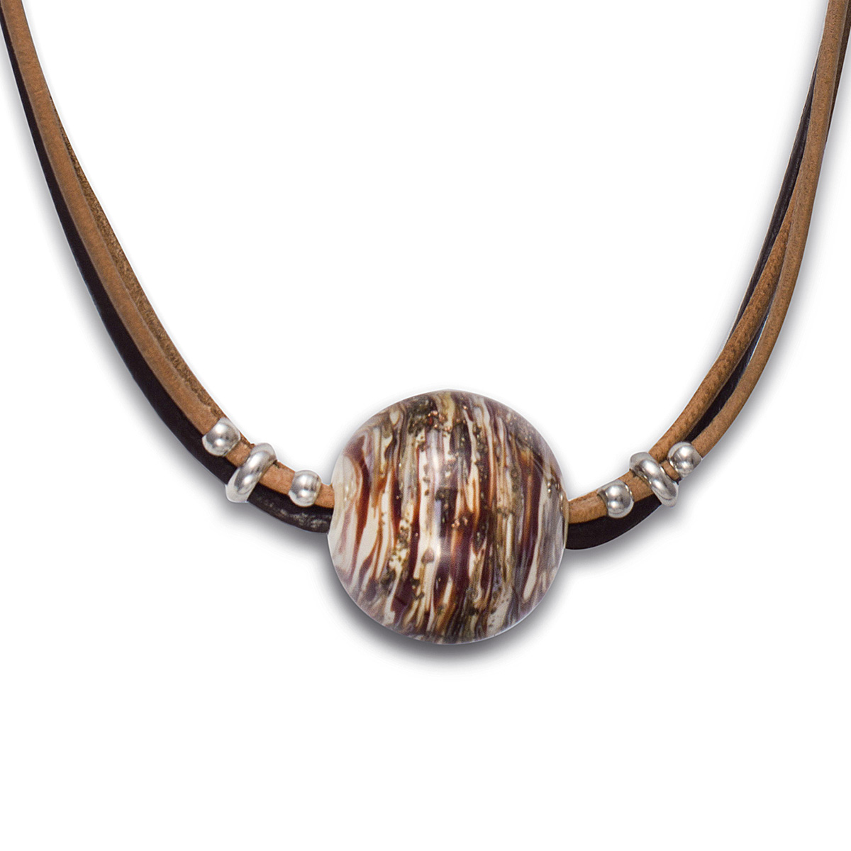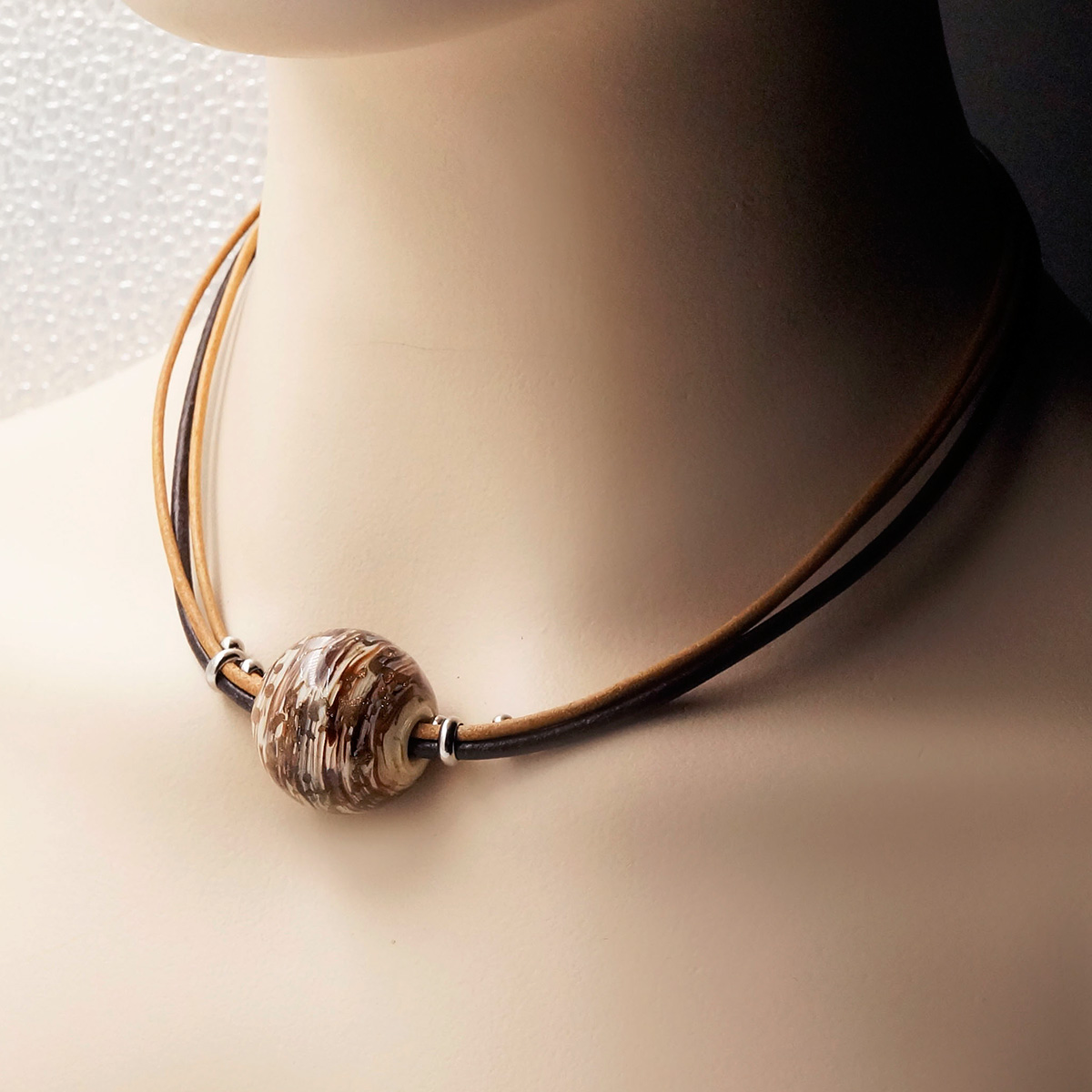 Колье изготовлено из натуральной кожи, муранского стекла и гипоаллергенной ювелирной стали, что очень важно для людей с чувствительной кожей. Металл не темнеет и не подвергается воздействиям окружающей среды, надолго обеспечивая красивый внешний вид изделия. Длина колье - 46 см + 5 см. удлиняющая цепочка. Диаметр шара - 2,5 см. Вес - 29 гр.