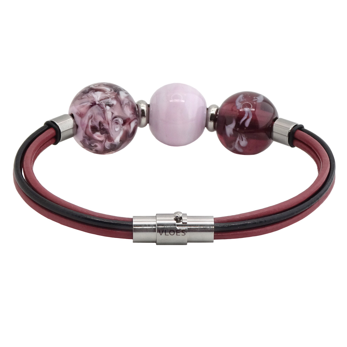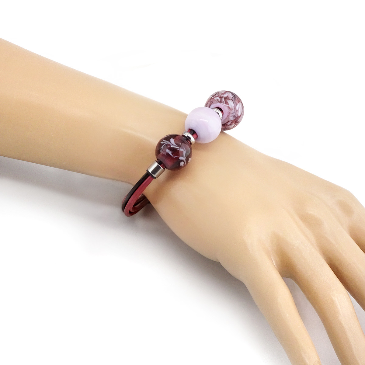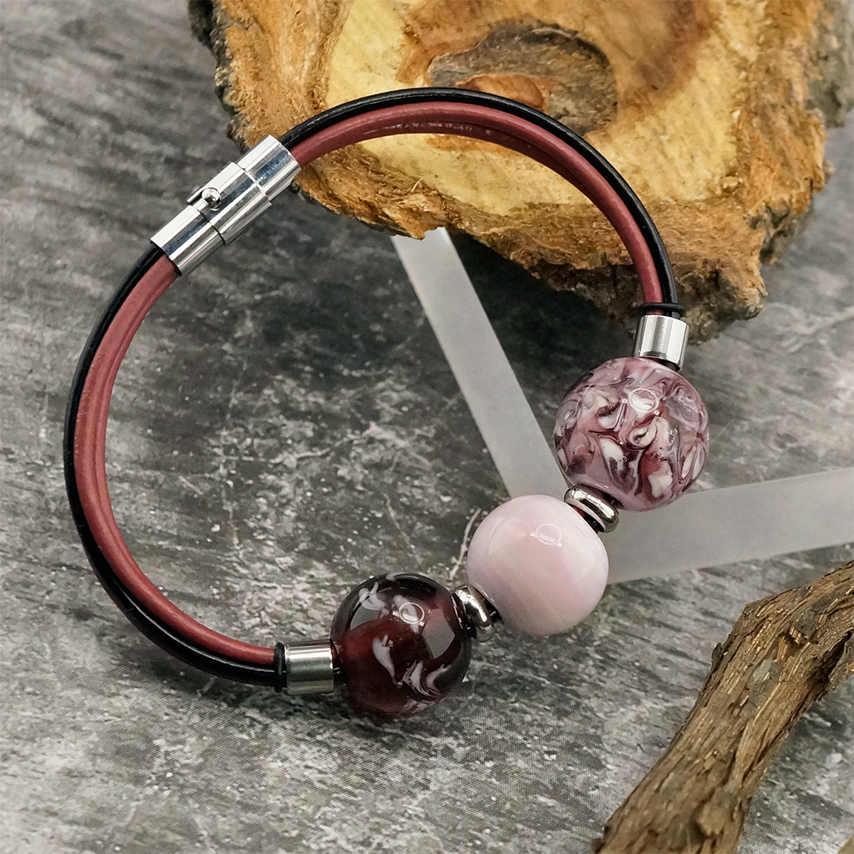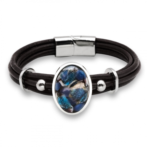Браслет изготовлен из муранского стекла, натуральной кожи и гипоаллергенной ювелирной стали, что очень важно для людей с чувствительной кожей. Металл не темнеет и не подвергается воздействиям окружающей среды, надолго обеспечивая красивый внешний вид изделия. Крепкий магнитный замок надежно фиксируется на запястье. Ширина браслета - 0,5 см. Диаметр стеклянного шара 1,8 см. Вес - 15 гр.