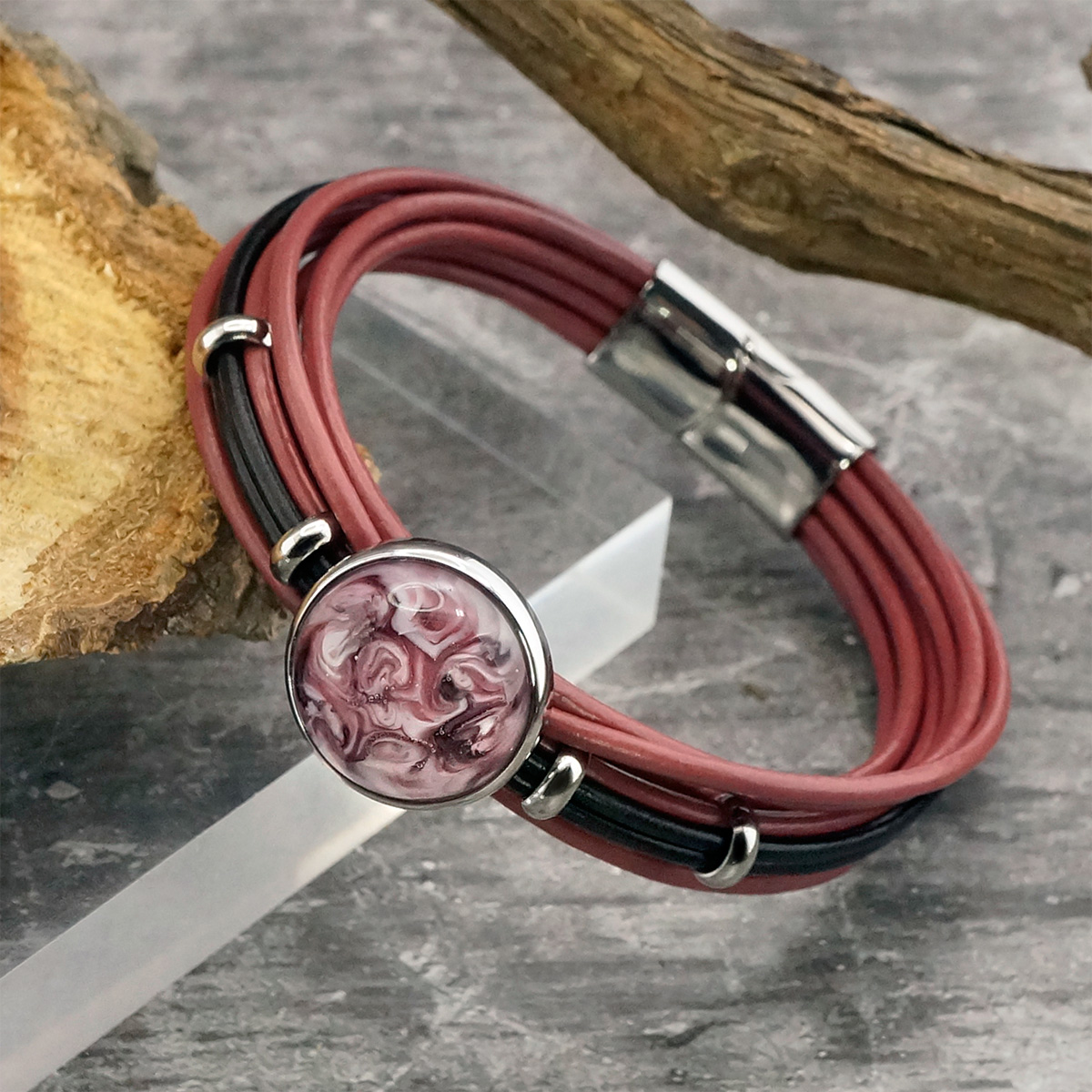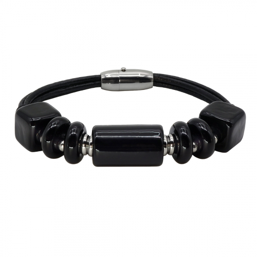 Браслет изготовлен из муранского стекла, натуральной кожи и гипоаллергенной ювелирной стали, что очень важно для людей с чувствительной кожей. Металл не темнеет и не подвергается воздействиям окружающей среды, надолго обеспечивая красивый внешний вид изделия.Крепкий магнитный замок с двойной защитой надежно фиксируется на запястье. Ширина браслета - 1,5 см. Диаметр стеклянного элемента - 2 см. Вес - 24 гр.