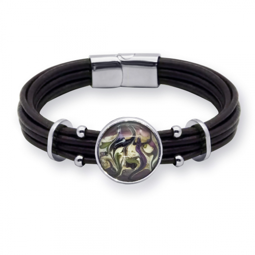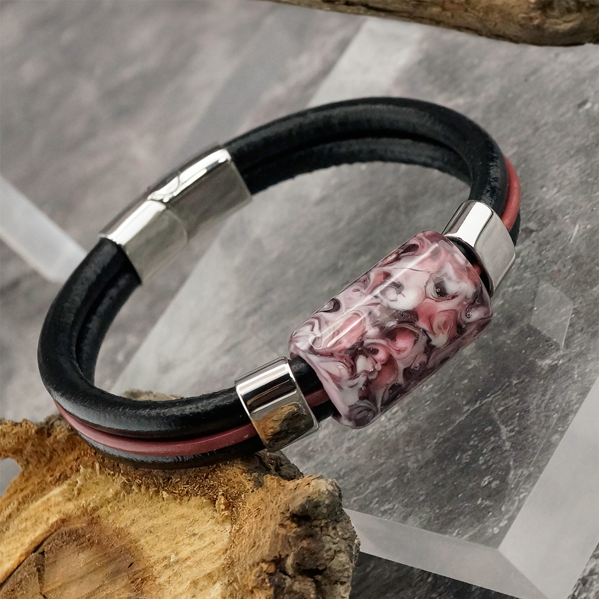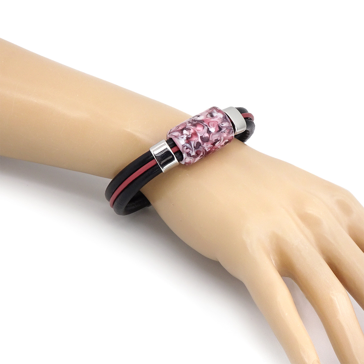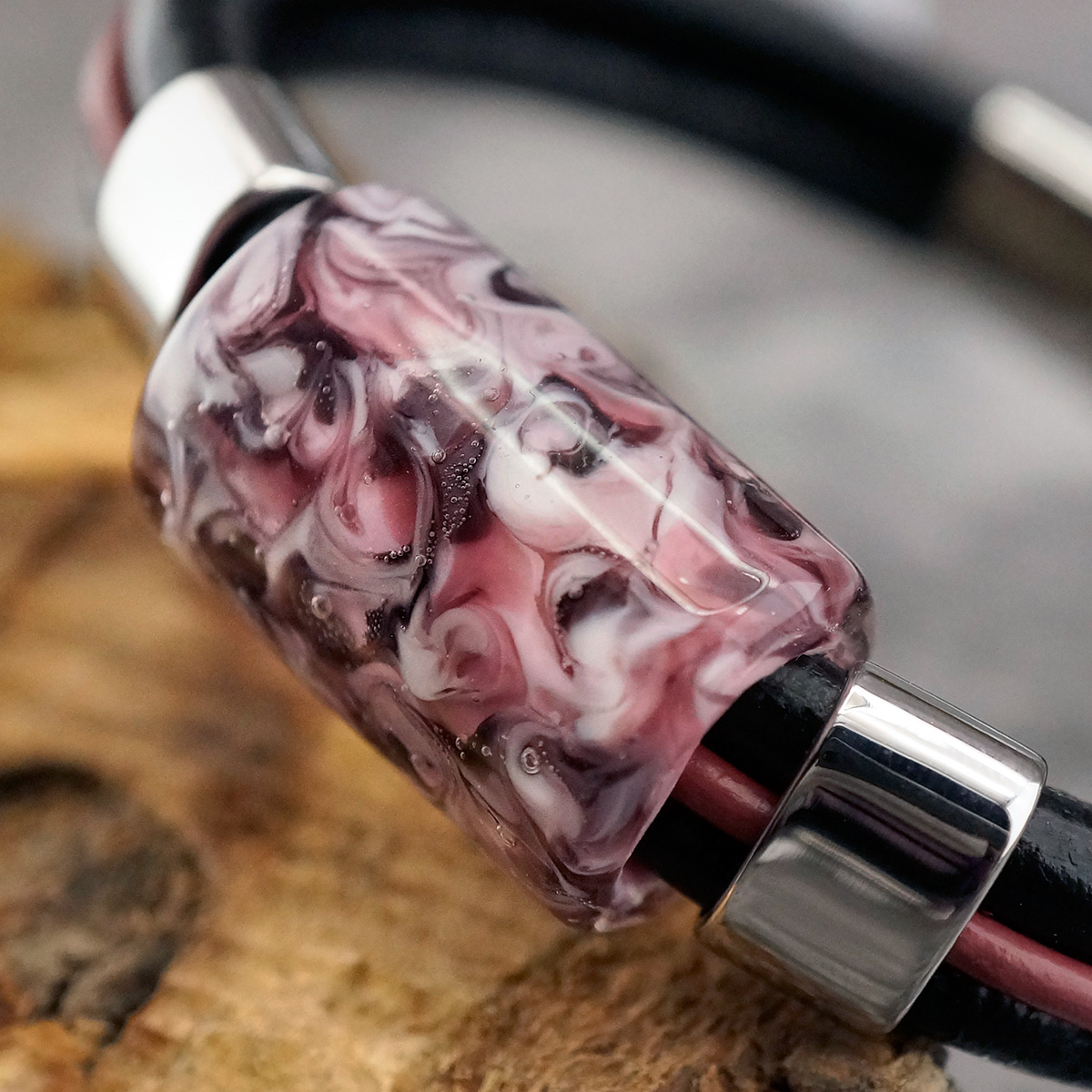 Браслет изготовлен из муранского стекла, натуральной кожи и гипоаллергенной ювелирной стали, что очень важно для людей с чувствительной кожей. Металл не темнеет и не подвергается воздействиям окружающей среды, надолго обеспечивая красивый внешний вид изделия. Крепкий магнитный замок с двойной защитой надежно фиксируется на запястье. Ширина браслета - 1,5 см. Размер стеклянной бусины - 1,9x2,5 см. Вес - 30 гр.
