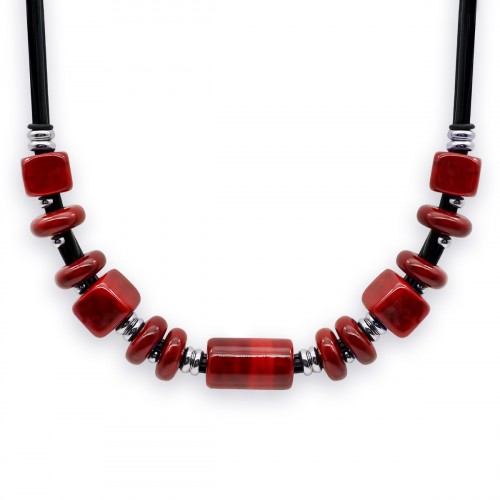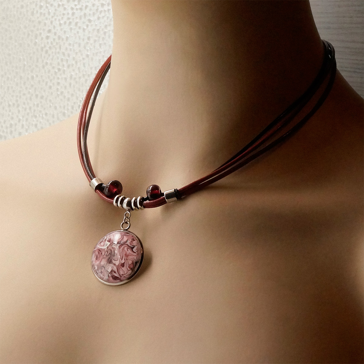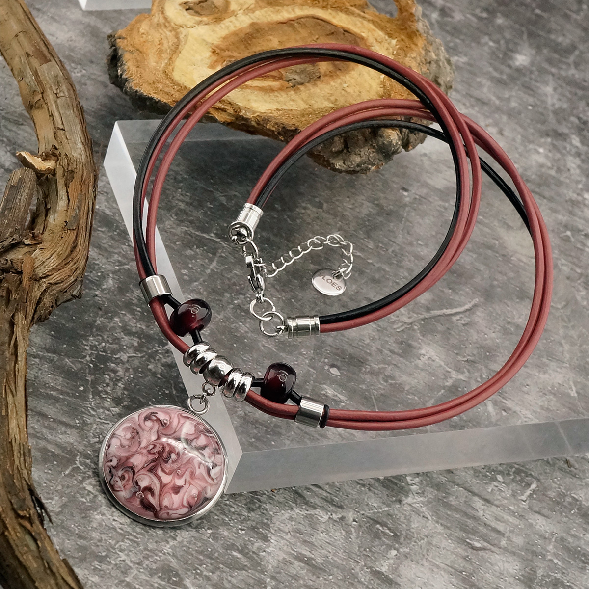 Колье изготовлено из натуральной кожи, муранского стекла и гипоаллергенной ювелирной стали, что очень важно для людей с чувствительной кожей. Металл не темнеет и не подвергается воздействиям окружающей среды, надолго обеспечивая красивый внешний вид изделия. Длина колье - 46 см + 5 см. удлиняющая цепочка. Длина кулона - 7 см. Диаметр стеклянного элемента - 2,5 см. Вес - 17 гр.