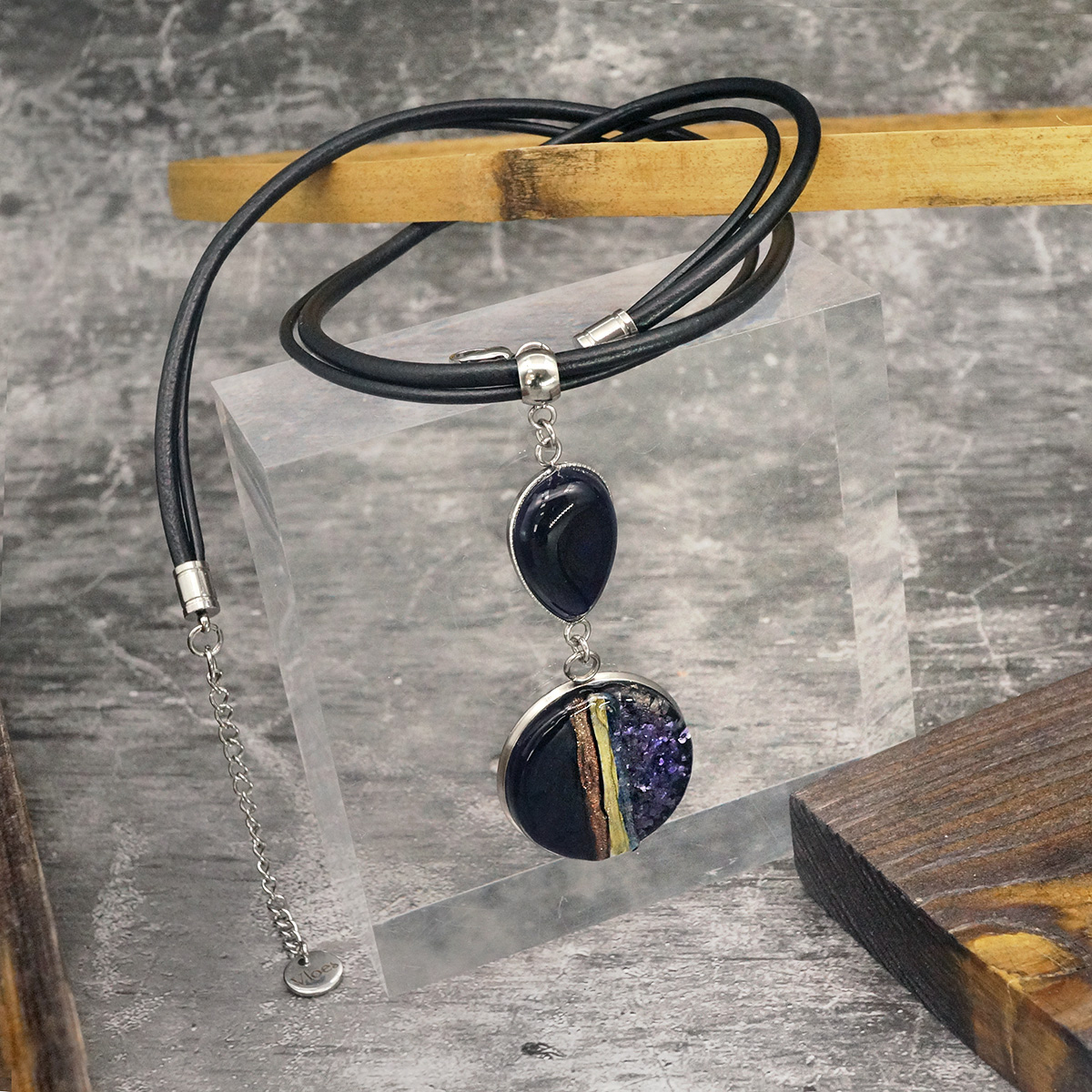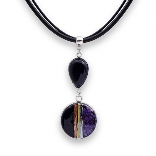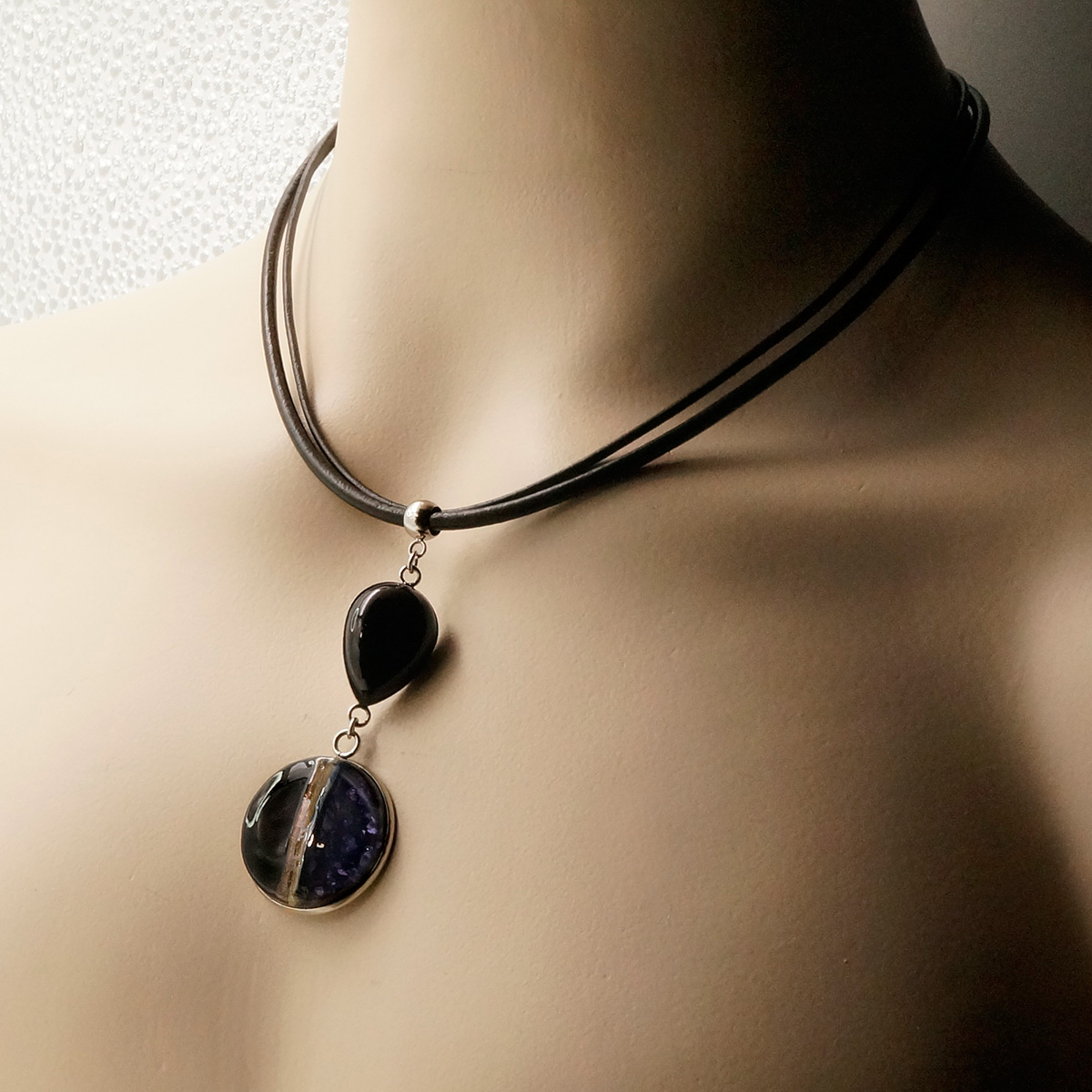 Колье изготовлено из натуральной кожи, муранского стекла и гипоаллергенной ювелирной стали, что очень важно для людей с чувствительной кожей. Металл не темнеет и не подвергается воздействиям окружающей среды, надолго обеспечивая красивый внешний вид изделия. Длина колье - 46 см + 5 см. удлиняющая цепочка. Размер стеклянных элементов - 2,6х2 и 2,5 см. Вес - 18 гр.
