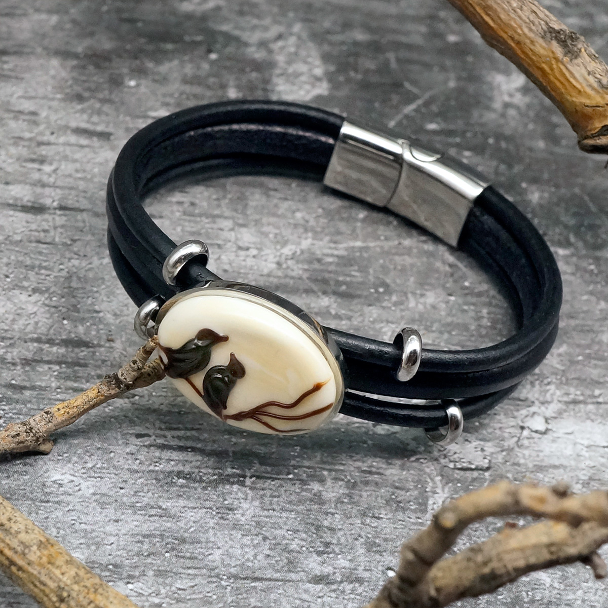 Браслет изготовлен из муранского стекла, натуральной кожи и гипоаллергенной ювелирной стали, что очень важно для людей с чувствительной кожей. Металл не темнеет и не подвергается воздействиям окружающей среды, надолго обеспечивая красивый внешний вид изделия. Крепкий магнитный замок с двойной защитой надежно фиксируется на запястье. Ширина браслета - 1,5 см. Размер стеклянного элемента - 1,9x2,6 см. Вес - 22 гр.