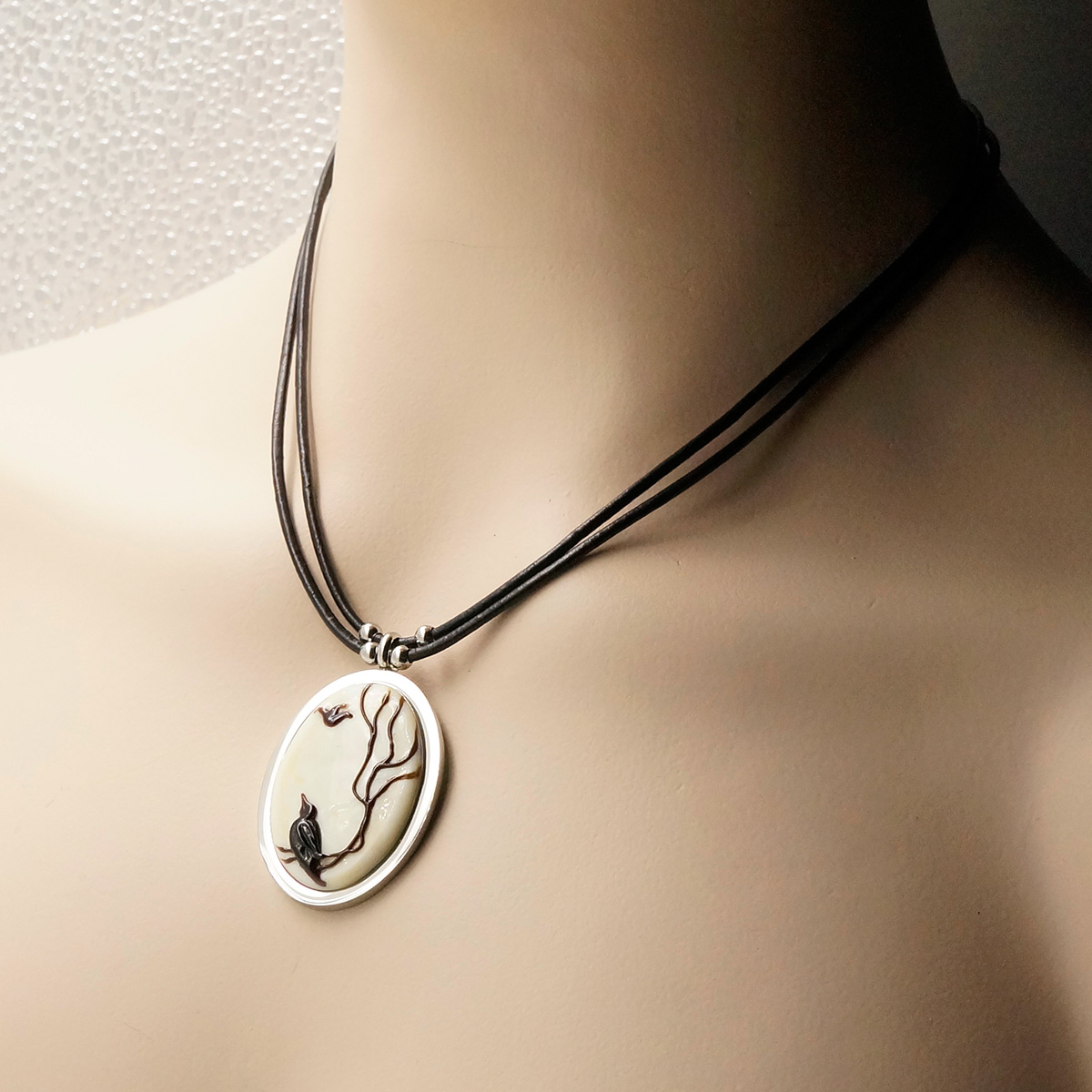 Колье изготовлено из натуральной кожи, муранского стекла и гипоаллергенной ювелирной стали, что очень важно для людей с чувствительной кожей. Металл не темнеет и не подвергается воздействиям окружающей среды, надолго обеспечивая красивый внешний вид изделия. Длина колье - 46 см + 5 см. удлиняющая цепочка. Размер стеклянного элемента - 4х3 см. Вес - 22  гр.