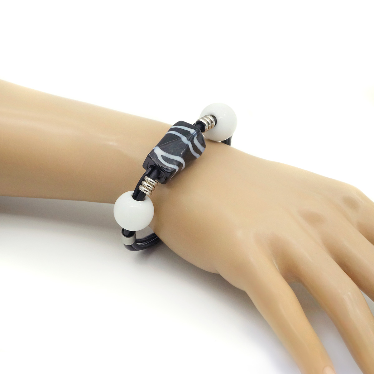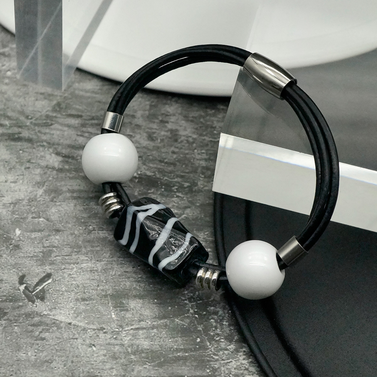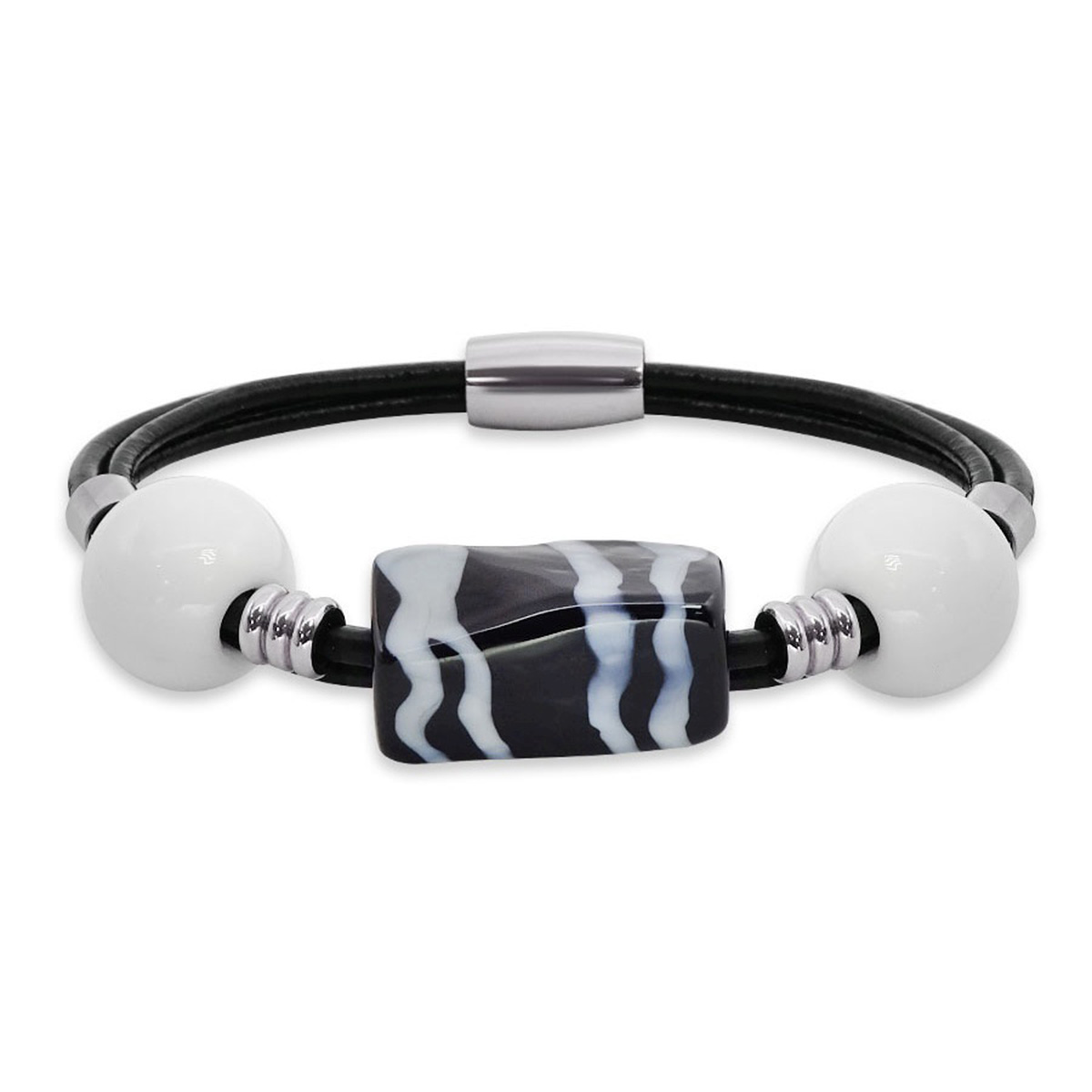 Браслет изготовлен из муранского стекла, натуральной кожи и гипоаллергенной ювелирной стали, что очень важно для людей с чувствительной кожей. Металл не темнеет и не подвергается воздействиям окружающей среды, надолго обеспечивая красивый внешний вид изделия. Крепкий магнитный замок надежно фиксируется на запястье. Ширина браслета - 0,5 см. Размер стеклянной бусины - 1,4*2,3 см. Диаметр стеклянных шариков - 1,2 см. Вес - 25 гр.