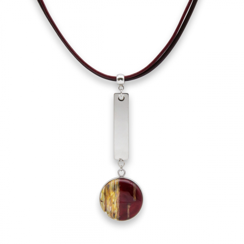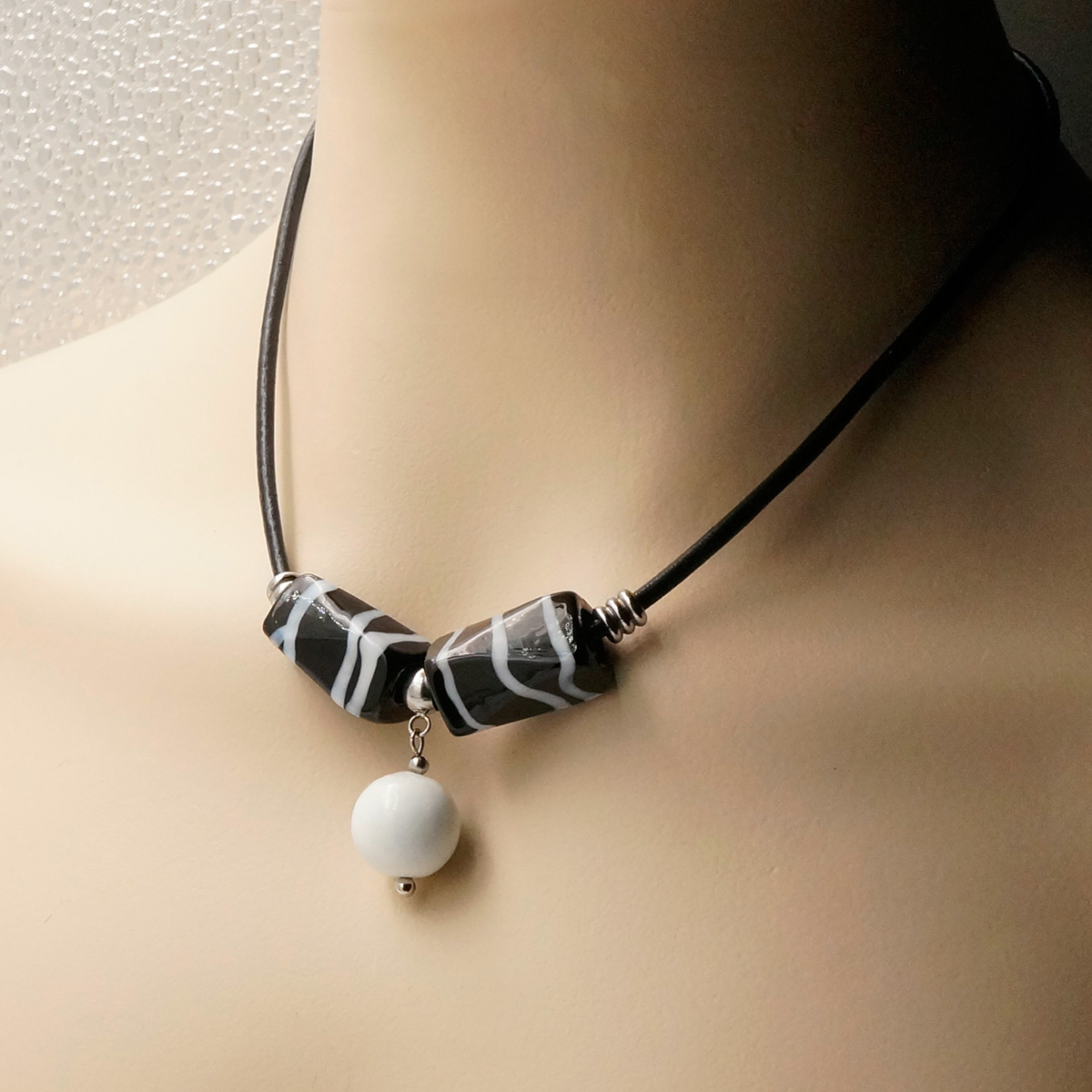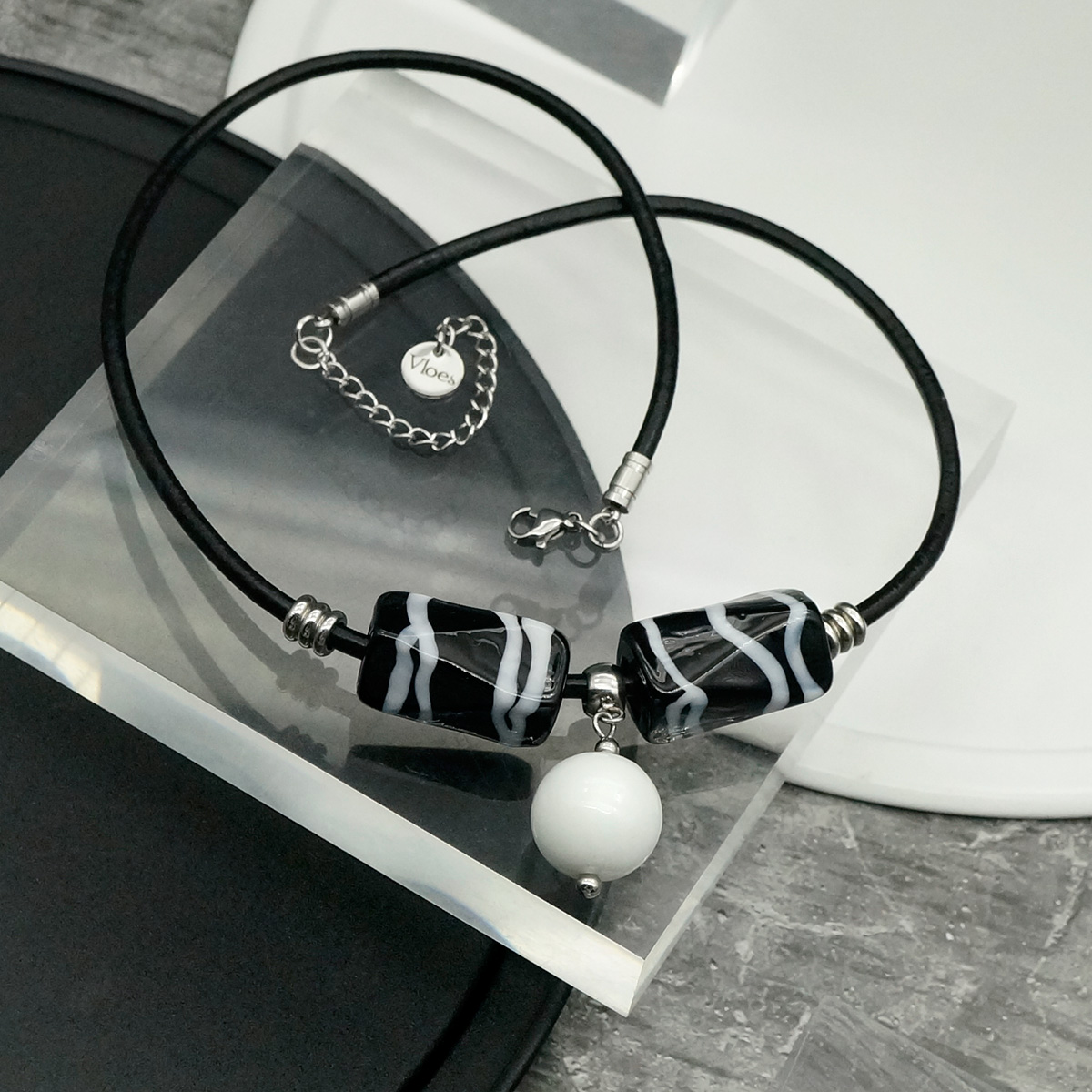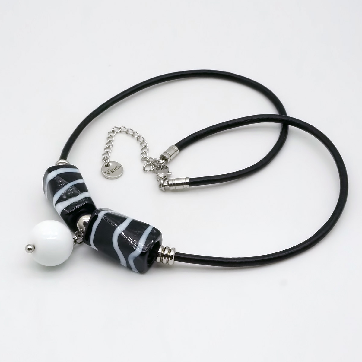 Колье изготовлено из натуральной кожи, муранского стекла и гипоаллергенной ювелирной стали, что очень важно для людей с чувствительной кожей. Металл не темнеет и не подвергается воздействиям окружающей среды, надолго обеспечивая красивый внешний вид изделия. Длина колье - 46 см + 5 см. удлиняющая цепочка. Размер стеклянных элементов - 1,4х2,3 см. Диаметр шара - 1,2 см. Вес - 29 гр.