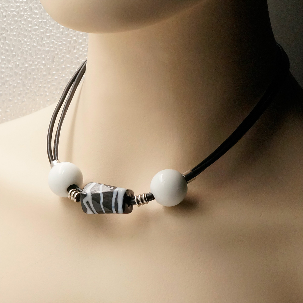 Колье изготовлено из натуральной кожи, муранского стекла и гипоаллергенной ювелирной стали, что очень важно для людей с чувствительной кожей. Металл не темнеет и не подвергается воздействиям окружающей среды, надолго обеспечивая красивый внешний вид изделия. Длина колье - 46 см + 5 см. удлиняющая цепочка. Размер стеклянного элемента - 1,4х2,3 см. Диаметр шаров - 1,5 см. Вес - 35 гр.