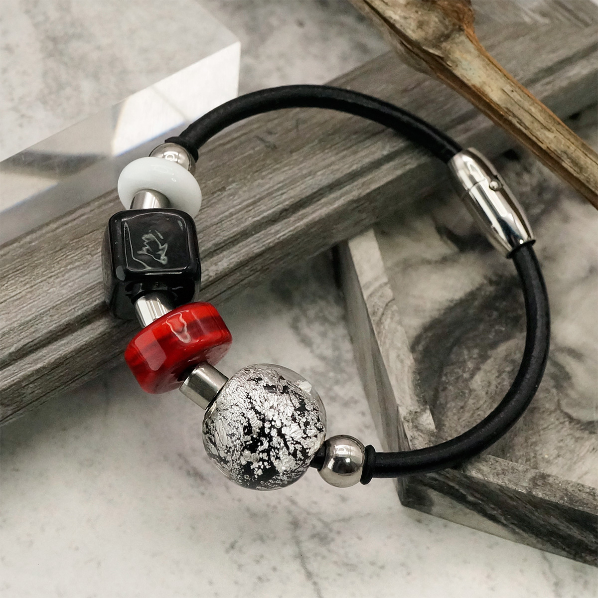 Браслет изготовлен из муранского стекла, натуральной кожи и гипоаллергенной ювелирной стали, что очень важно для людей с чувствительной кожей. Металл не темнеет и не подвергается воздействиям окружающей среды, надолго обеспечивая красивый внешний вид изделия. Крепкий магнитный замок надежно фиксируется на запястье. Ширина браслета - 0,5 см. Диаметр стеклянных элементов 1,3 и 1,8 см. Рондели 1,2х0,6. Вес -27 гр.