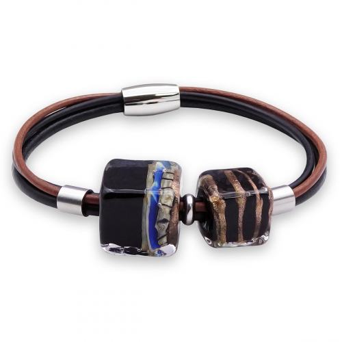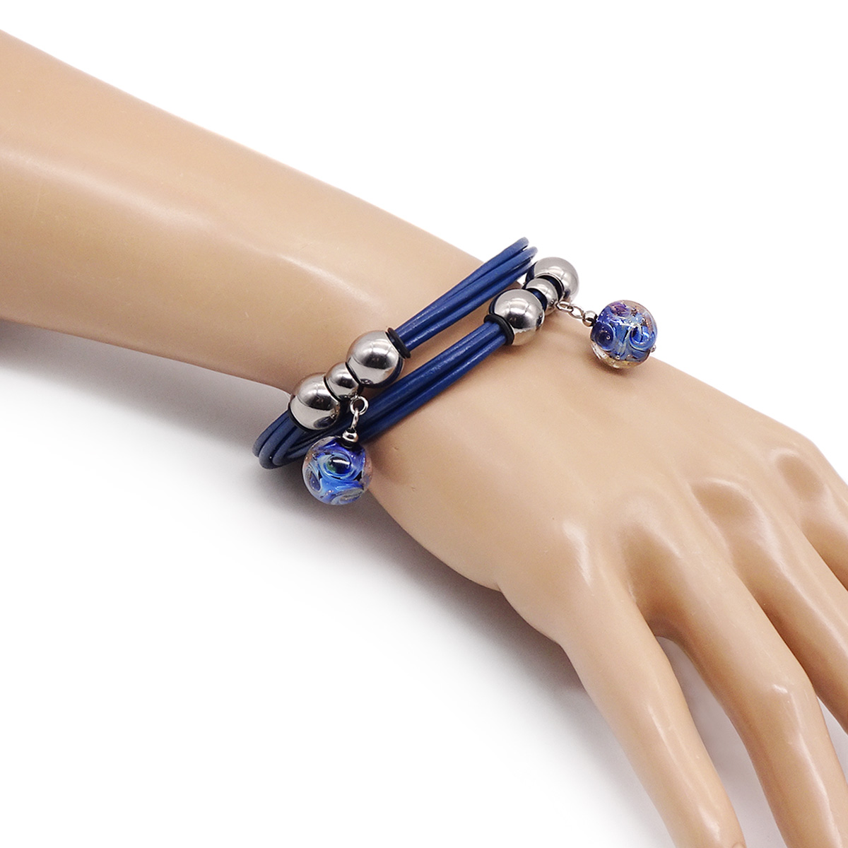 Браслет изготовлен из муранского стекла, натуральной кожи и гипоаллергенной ювелирной стали, что очень важно для людей с чувствительной кожей. Металл не темнеет и не подвергается воздействиям окружающей среды, надолго обеспечивая красивый внешний вид изделия. Крепкий магнитный замок надежно фиксируется на запястье. Ширина браслета - 2 см. Диаметр стеклянного шарика - 1,2 см. Вес - 13 гр.