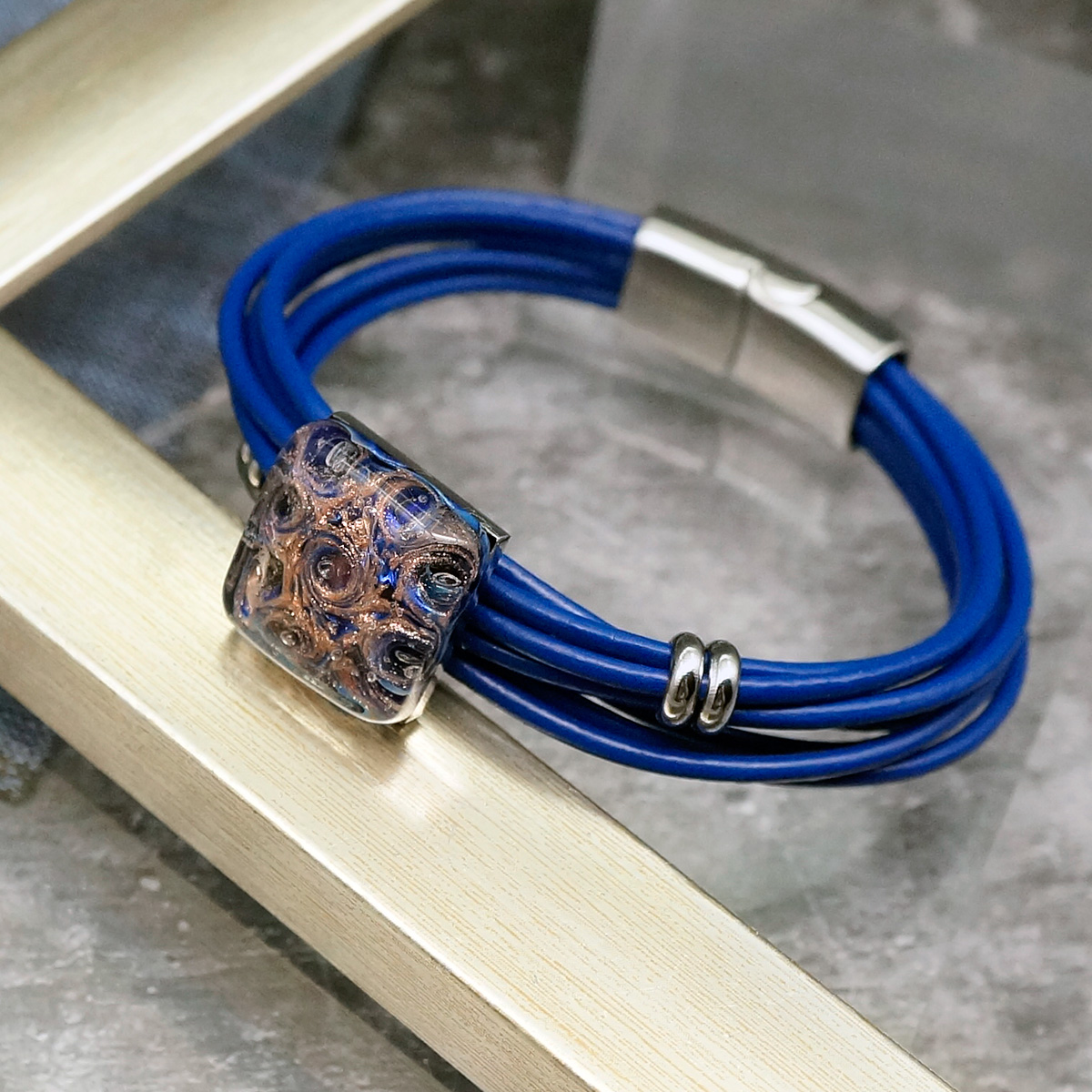 Браслет изготовлен из муранского стекла, натуральной кожи и гипоаллергенной ювелирной стали, что очень важно для людей с чувствительной кожей. Металл не темнеет и не подвергается воздействиям окружающей среды, надолго обеспечивая красивый внешний вид изделия. Крепкий магнитный замок с двойной защитой надежно фиксируется на запястье. Ширина браслета - 1,5 см. Размер стеклянного элемента - 1,6x1,6 см. Вес - 20 гр.