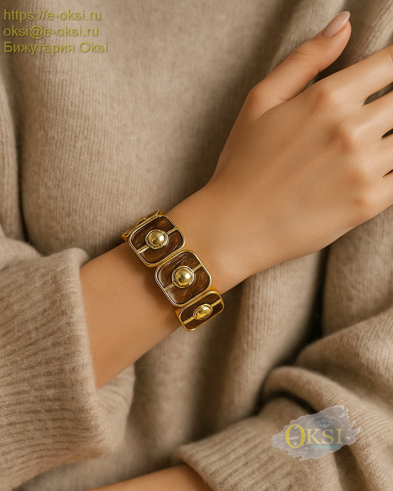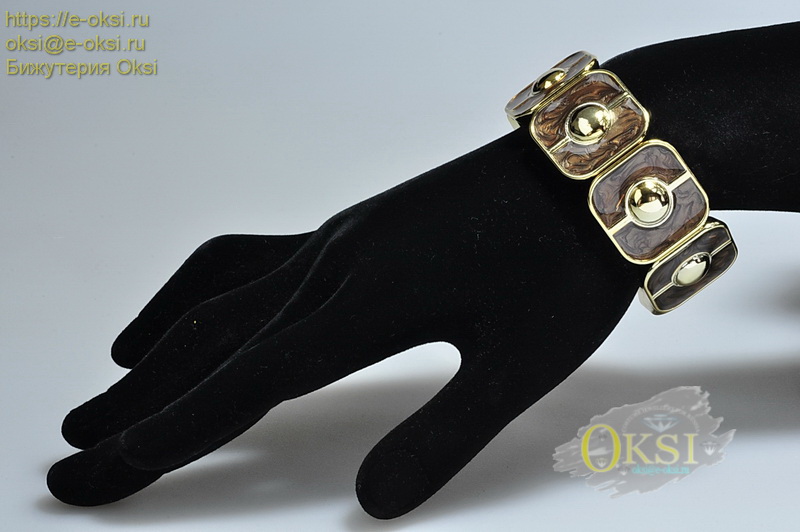 Стильный, очень лёгкий браслет удобно и комфортно сидит на руке, не мешает вести активный образ жизни. Перламутровая эмаль шоколадного цвета, качественное покрытие золотого цвета.. Браслет резинка, ширина 2,5 см. Безразмерный.