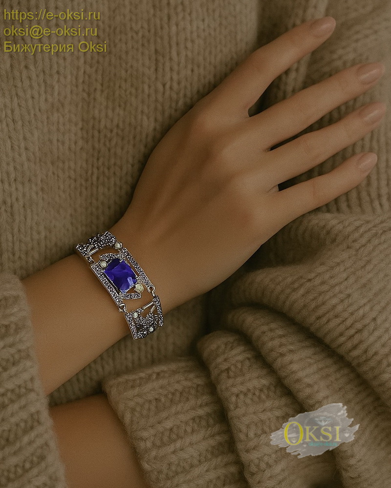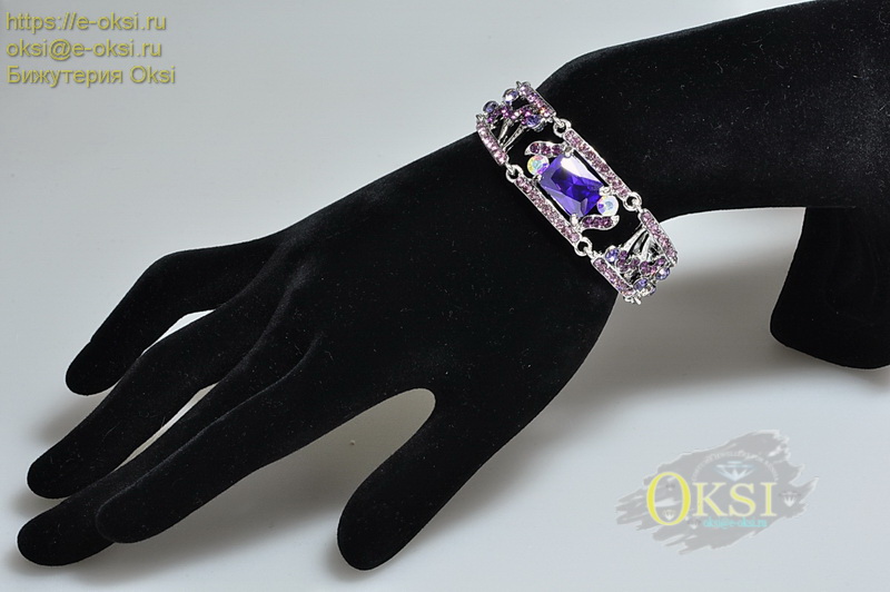 Очень красивый браслет с крупным австрийским кристаллом сиреневого оттенка, полностью инкрустирован сверкающими фианитами. Качественное родиевое покрытие серебряного цвета. Длина 18,5 см. Ширина 2 см..