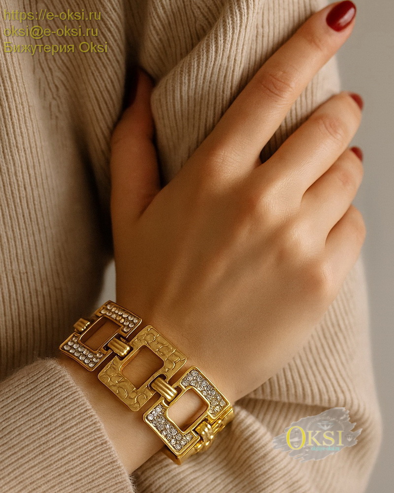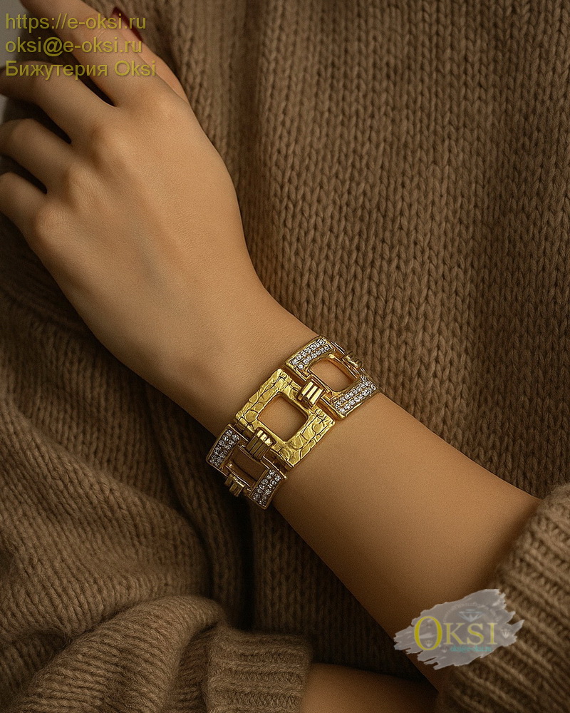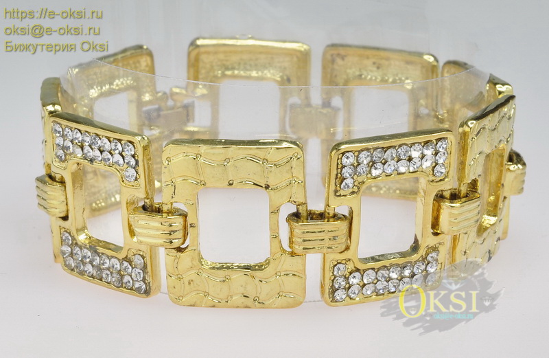 Роскошный браслет золотого цвета украшен сверкающими кристаллами. Золотой цвет самый популярный и привлекательный цвет в украшениях, является базовым и подходит к любому оттенку одежды и аксессуаров. Качественное гальваническое покрытие. Длина браслета 19 см, ширина( высота) 2,5 см.