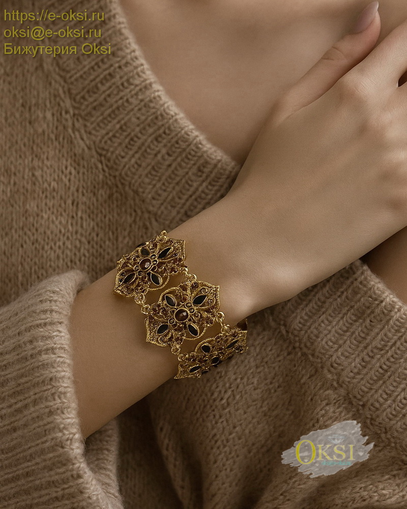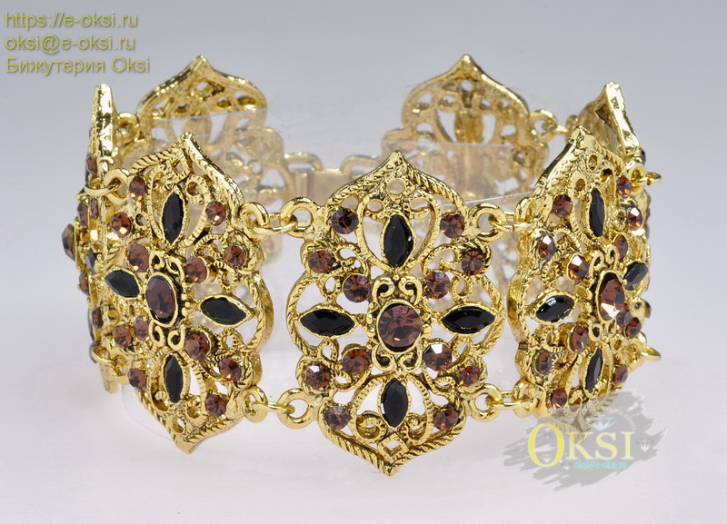 Очень красивый браслет украшен сверкающими кристаллами шоколадных оттенков. Качественное гальваническое покрытие золотого цвета. Длина браслета 17 см, ширина ( высота) 4 см.